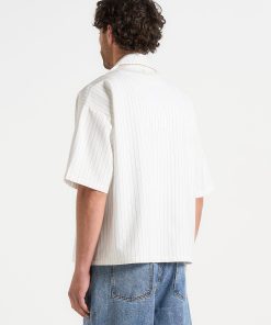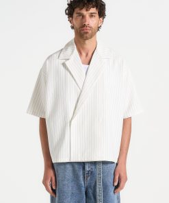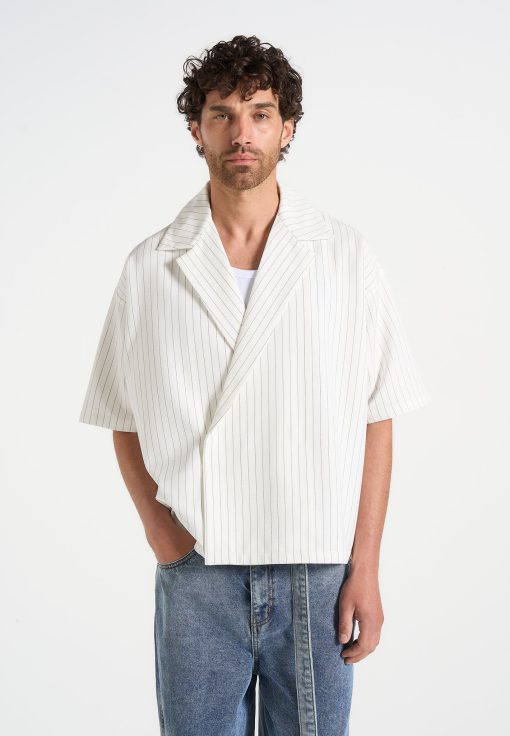 Made from a classic pinstripe fabric in a modern, everyday silhouette, our double-breasted boxy shirt is designed for a touch of structured elegance. Featuring a sharp open neckline in an oversized shape, the design is finished with a concealed internal fastening for a minimal, easy to style aesthetic.