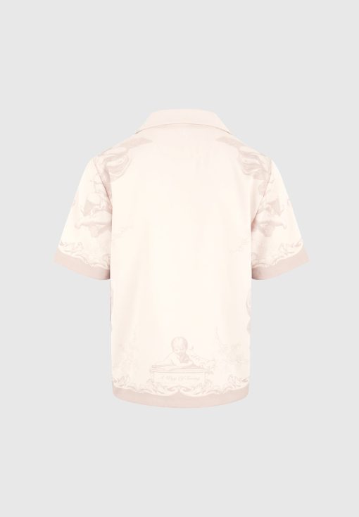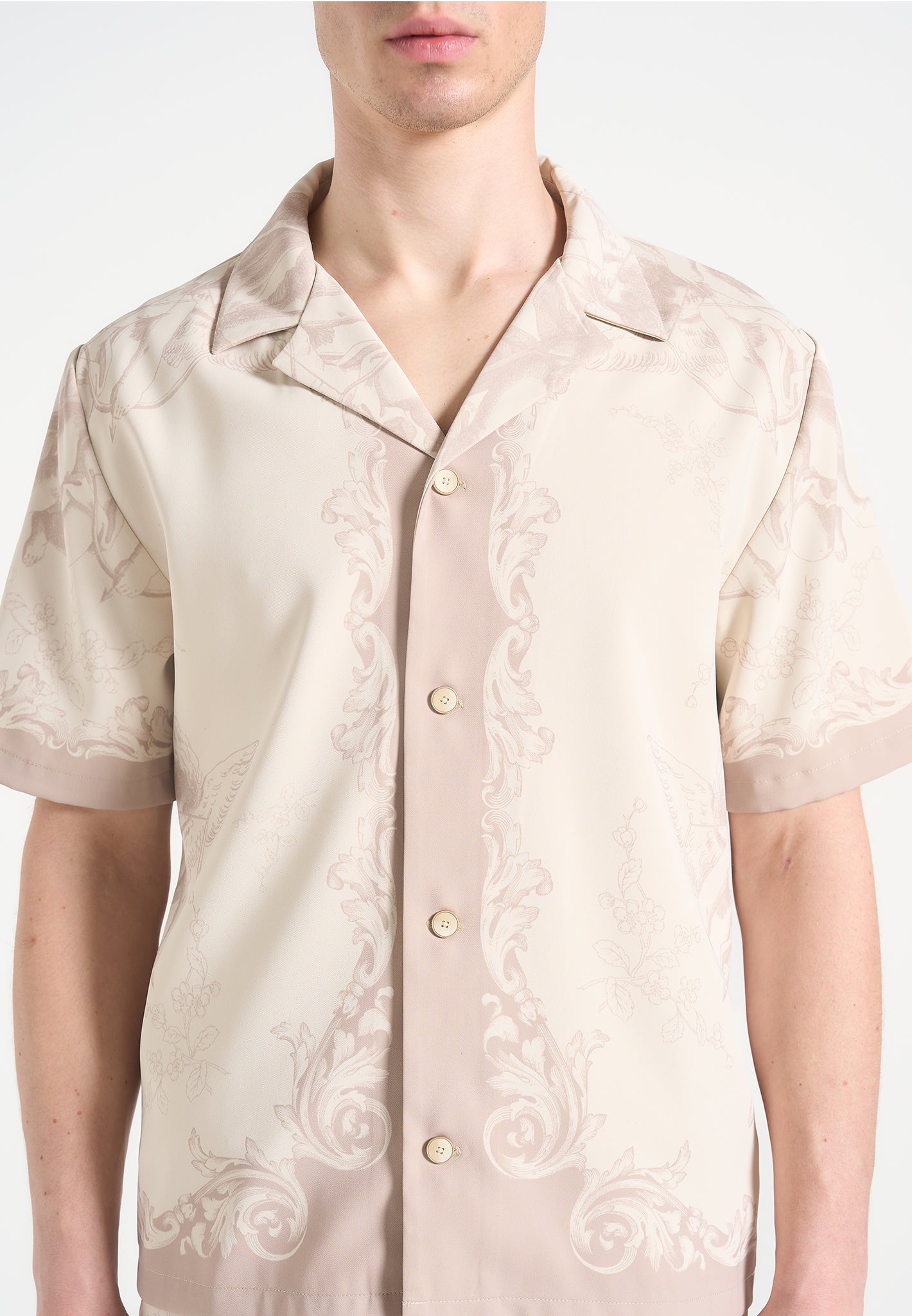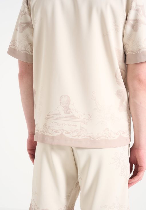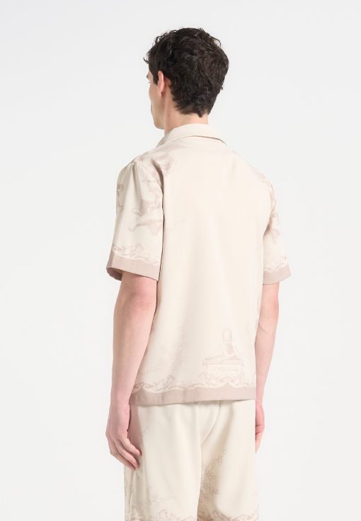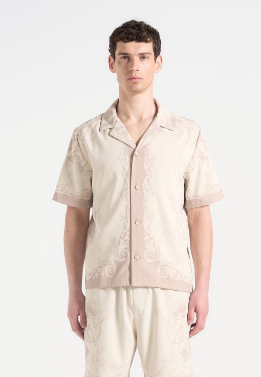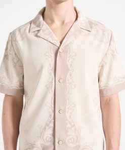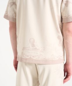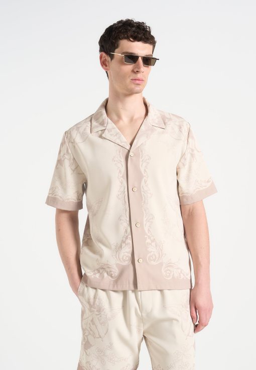Art meets escapism in the Signature Baroque Resort Shirt, where ornamental motifs and classical detailing define a refined vacation silhouette. Featuring an all-over baroque illustration and contrast paneling through the placket and hem, the shirt blends grand visuals with laid-back tailoring. The relaxed fit and open revere collar make it ideal for elevated summer styling.