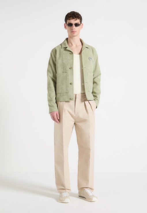 Elevate your style in the Suede Jacket with Revere Collar, a modern reinterpretation of classic outerwear that combines structure with effortless versatility. Crafted from high-quality vegan suede, it features a smooth inner lining and precision-stitched panelling for durability. The tailored fit is complemented by a revere collar and patch pockets, making it a sophisticated yet practical wardrobe essential.