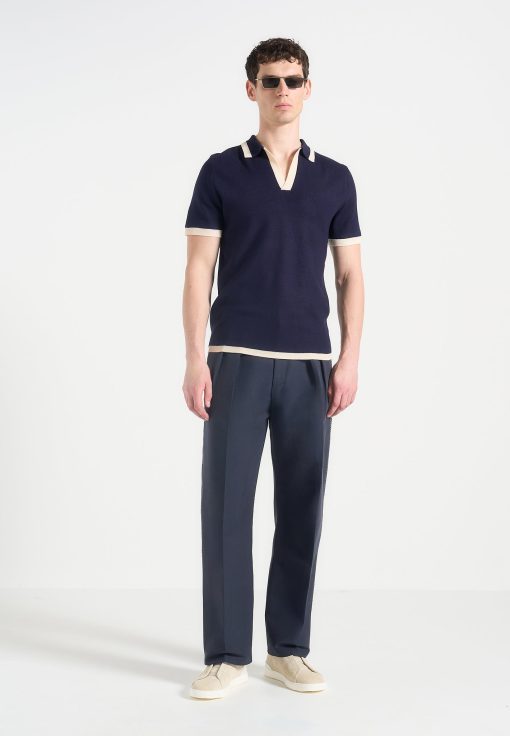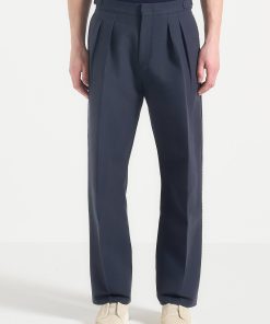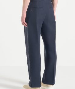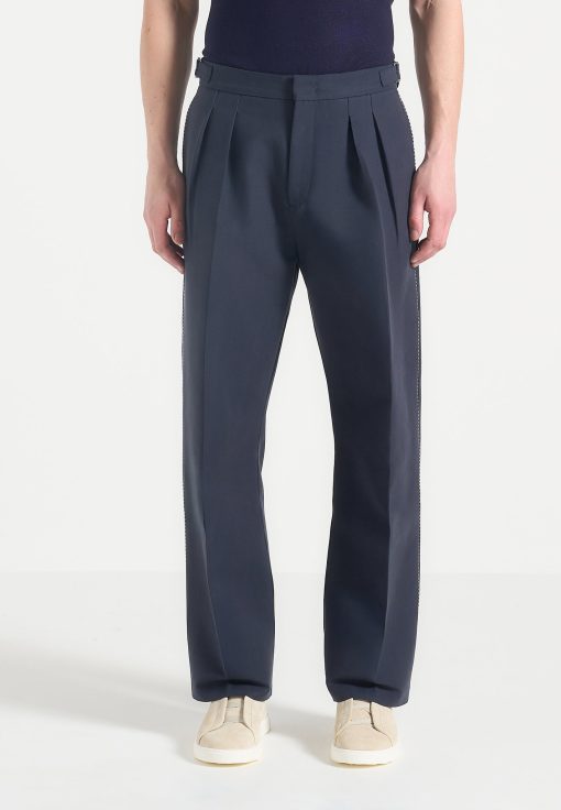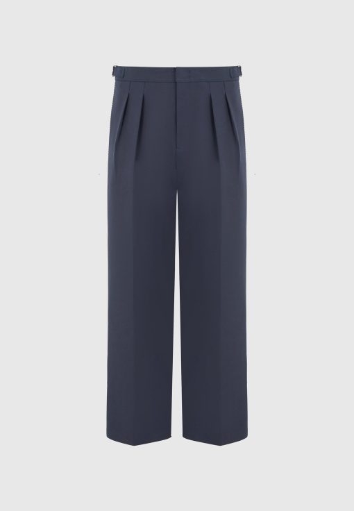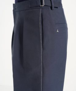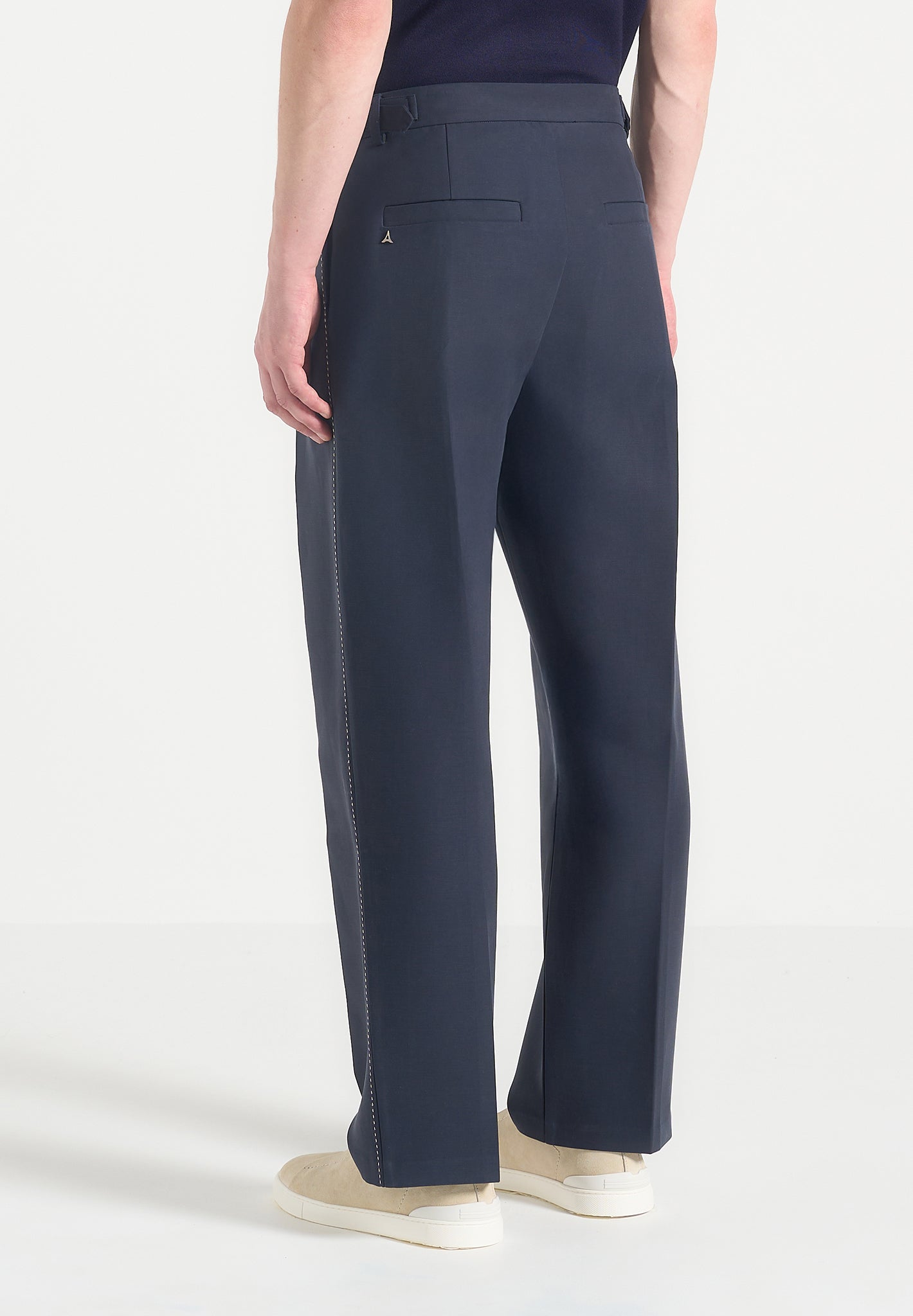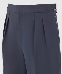 A refined take on traditional tailoring, the Twin Pleat Chino Trousers With Stitch Detail fuse classic structure with technical precision. Defined by sculptural twin front pleats and contrast topstitching along the leg seams, these trousers are finished with integrated side adjusters that deliver a custom fit without compromising the silhouette’s clean integrity.
