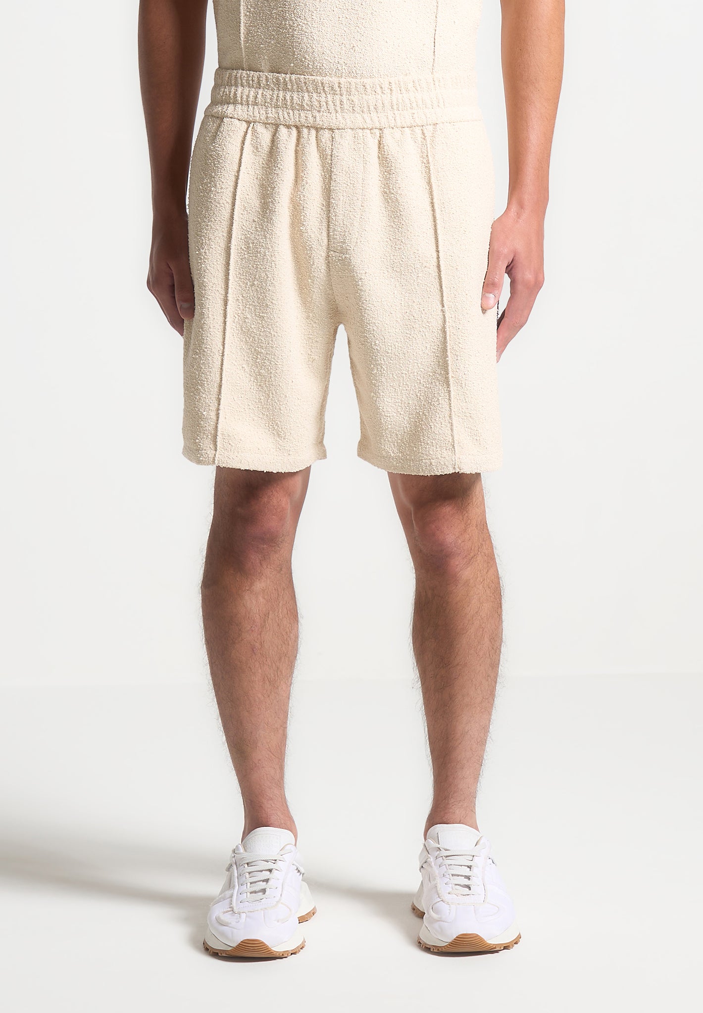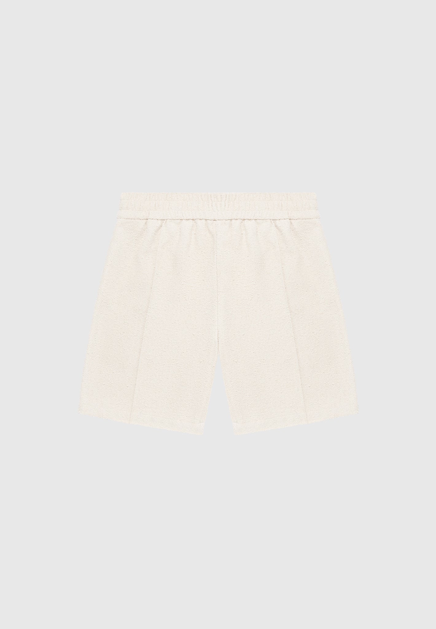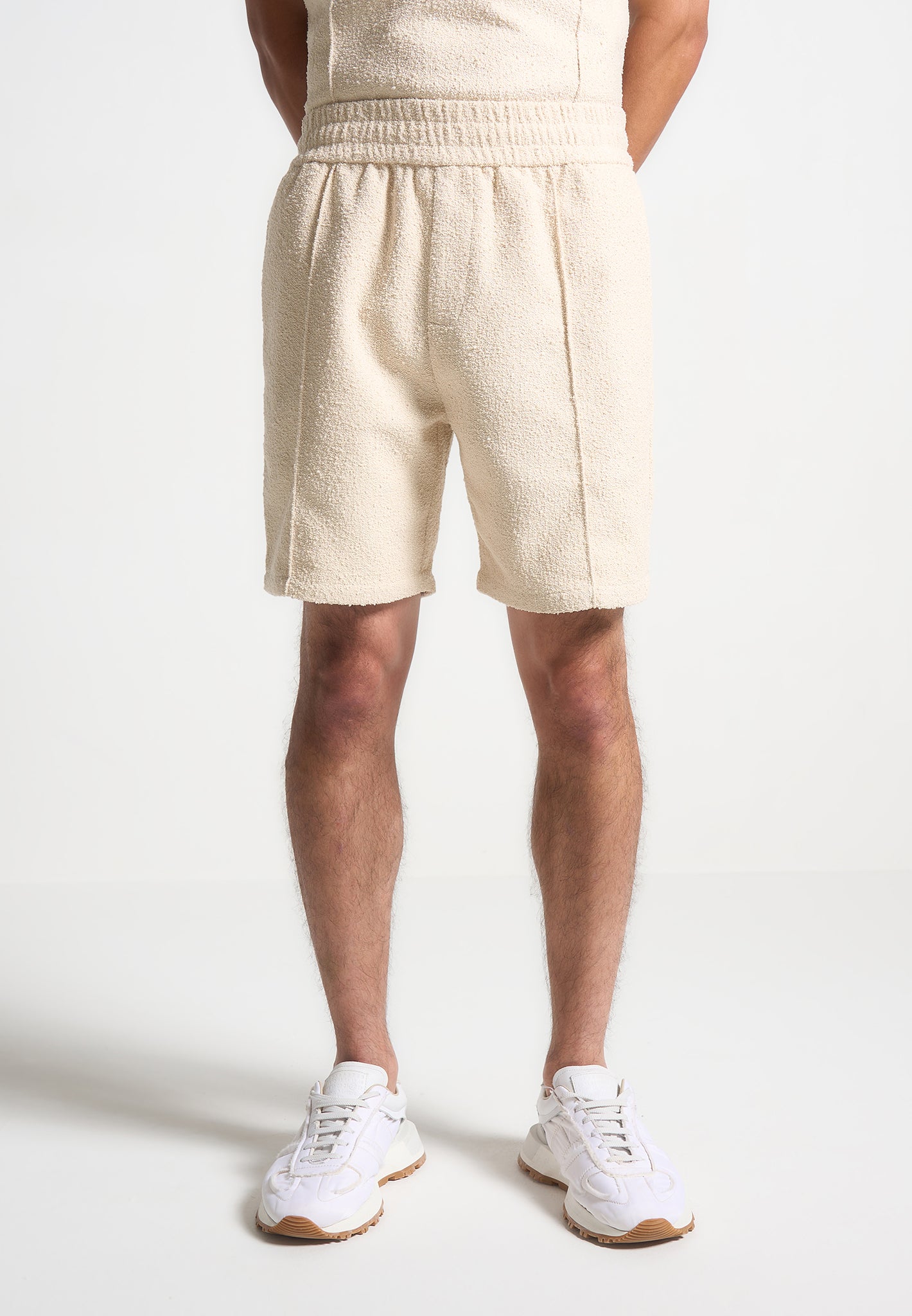 These Boucle Pintuck Shorts in Beige are made with a textured, high quality fabric, featuring an elasticated waistband for a comfortable fit and a pleat to crease detail for a modern touch. Perfect for any occasion, these shorts combine style and comfort effortlessly.