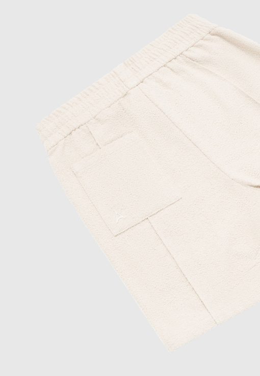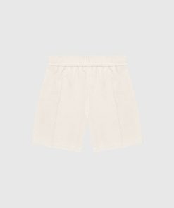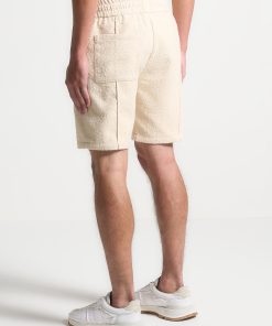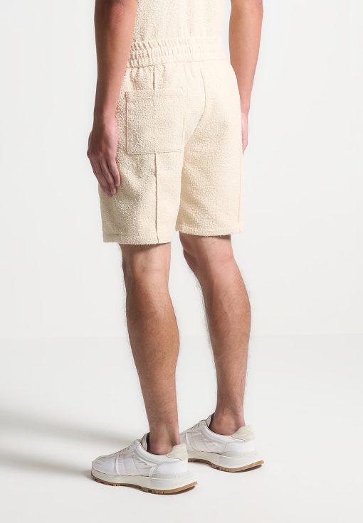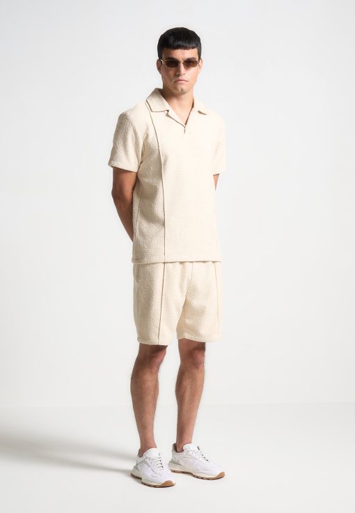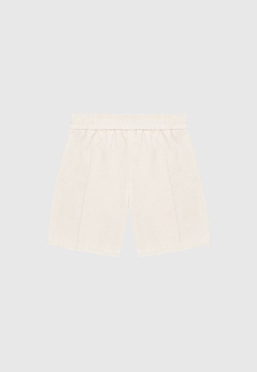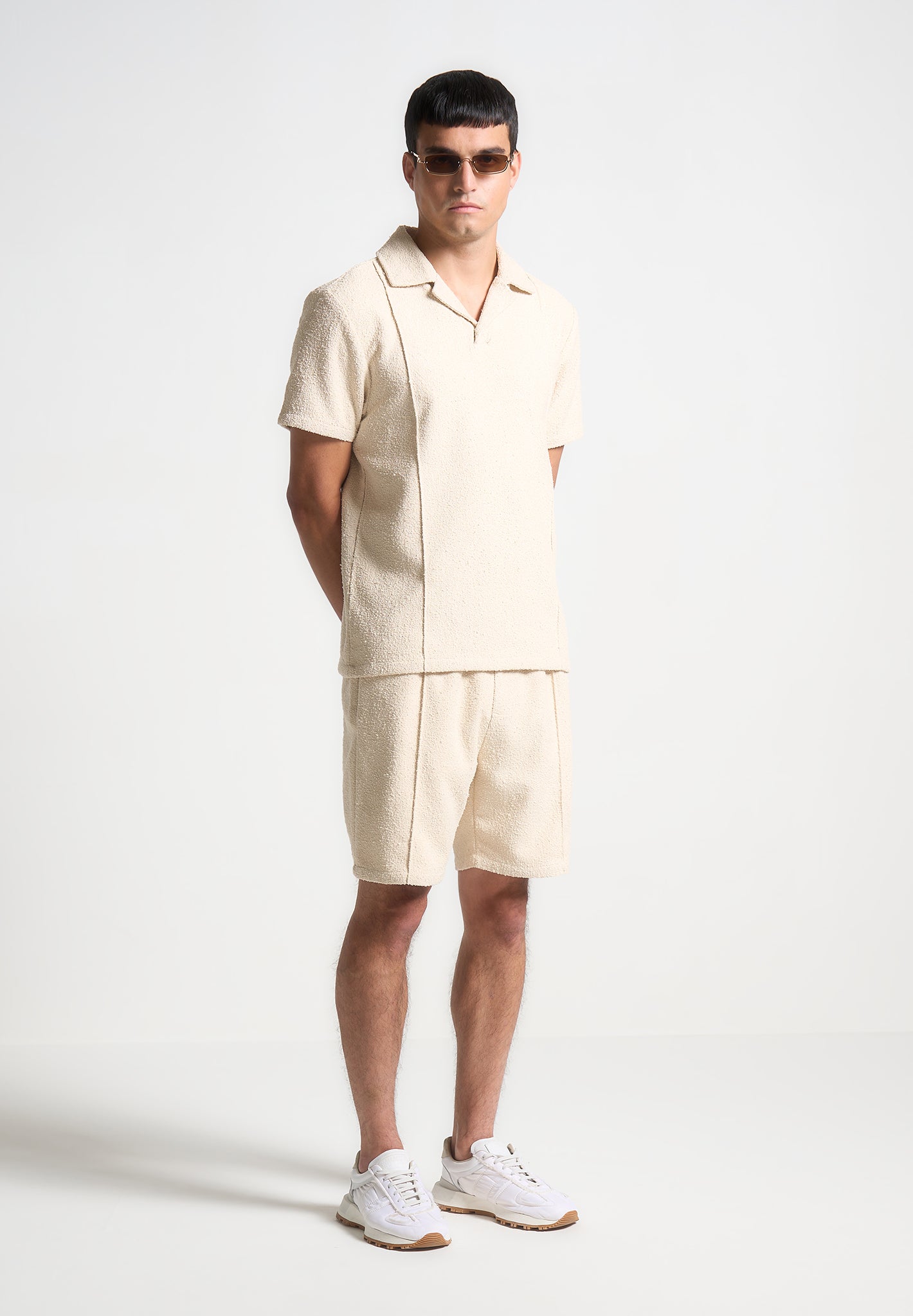 These Boucle Pintuck Shorts in Beige are made with a textured, high quality fabric, featuring an elasticated waistband for a comfortable fit and a pleat to crease detail for a modern touch. Perfect for any occasion, these shorts combine style and comfort effortlessly.