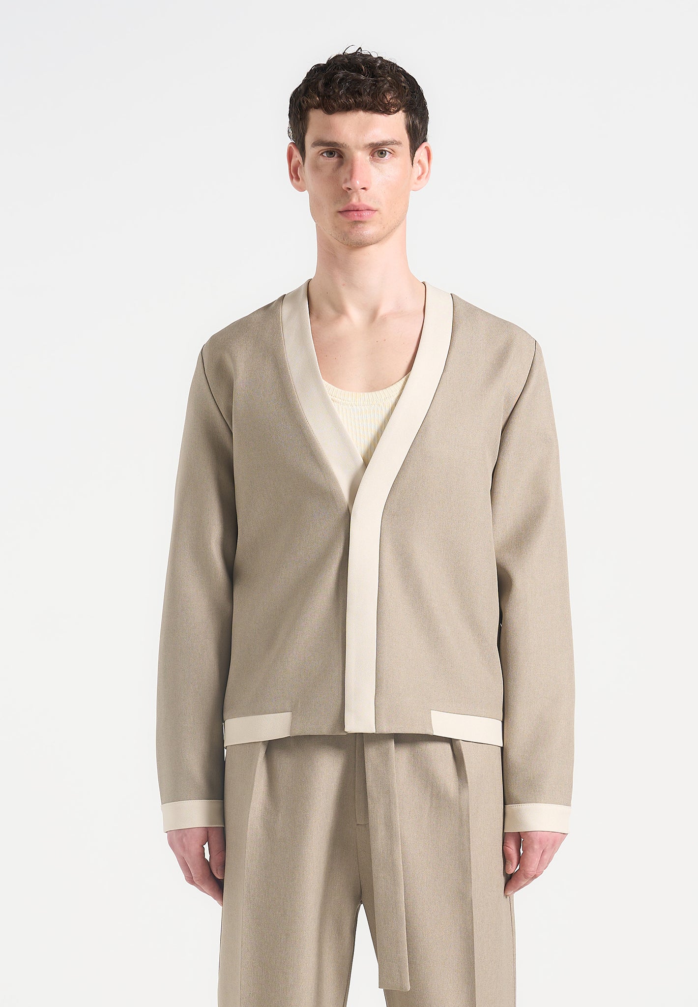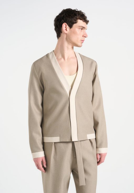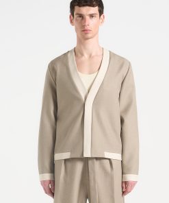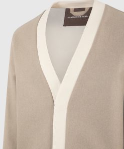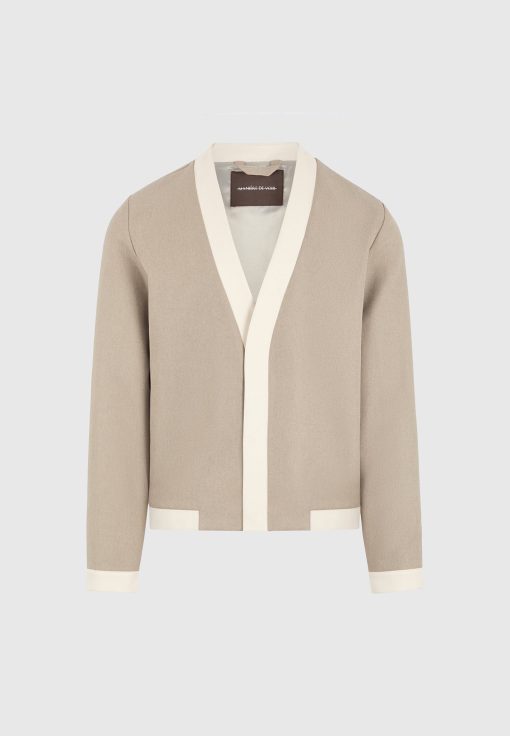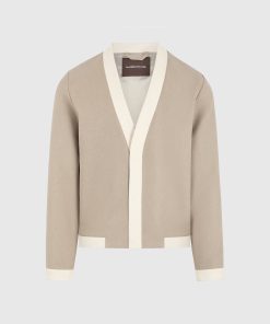 The Tailored Cardigan with Contrast Placket delivers refined layering with sharp visual balance. Cut with clean lines and no collar, its structured knit body is framed by bold contrast trims along the placket, cuffs, and hem. The result is a minimalist piece with a considered edge—built to elevate both casual and smart looks.