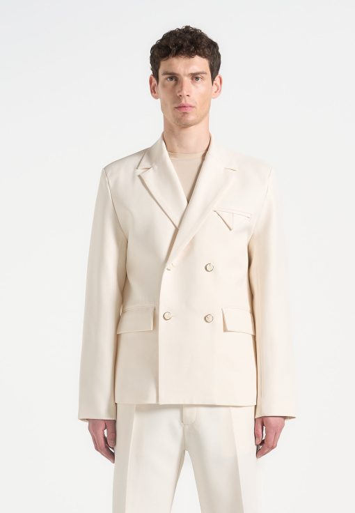 The Double Breasted Pinstripe Suit Jacket is a clean expression of modern tailoring. Cut from lightweight pinstripe suiting fabric, it features a sharp four-button front and peak lapels for a structured silhouette. Finished with flap pockets and an angular chest pocket, it brings subtle detail and strong form to spring tailoring.