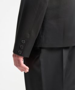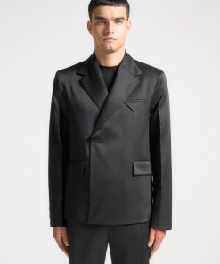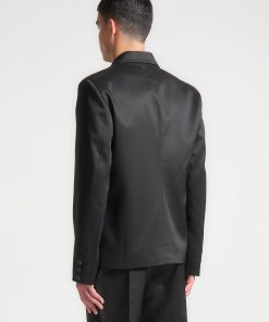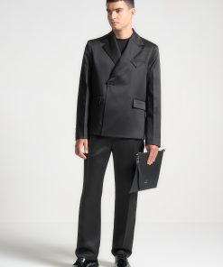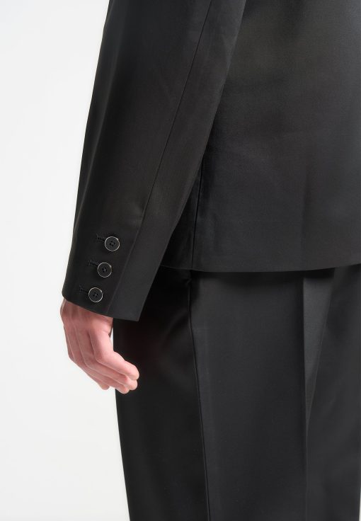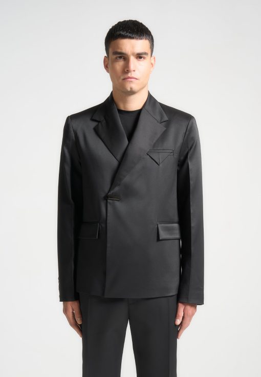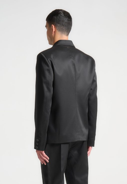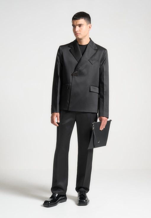 Introducing the Double Breasted Satin Suit Jacket in Black. Crafted from a subtle satin finish fabric, this Jacket features a modern double-breasted design with a classic blazer silhouette, complete with a metal clasp fastening for a secure, polished look. Pair it with the Satin Tailored Trousers in Black for a seamless ensemble, perfect for any formal occasion.