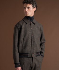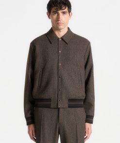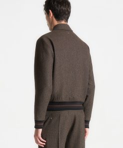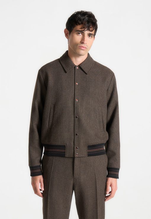The Houndstooth Wool-Blend Jacket in Brown offers a refined blend of warmth and style. Made from a 50% wool, 50% polyester blend with a classic houndstooth pattern, it features a tailored fit and structured silhouette with vintage appeal. Fully lined for smooth layering, this jacket combines natural insulation and polished detailing, making it an essential for cooler months. Pair with matching trousers for a complete look.
