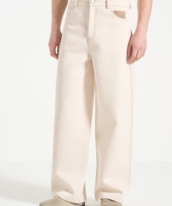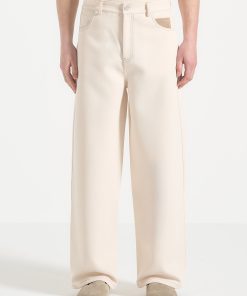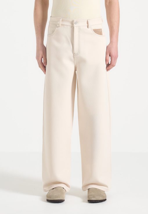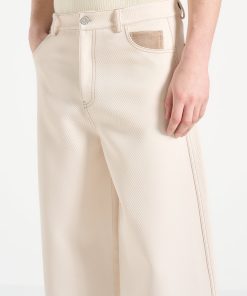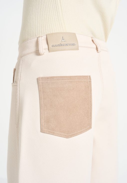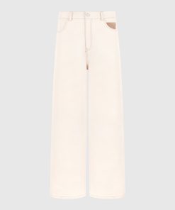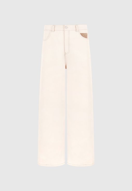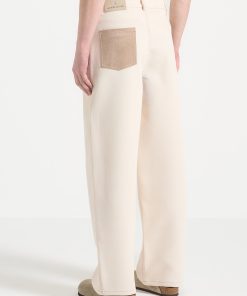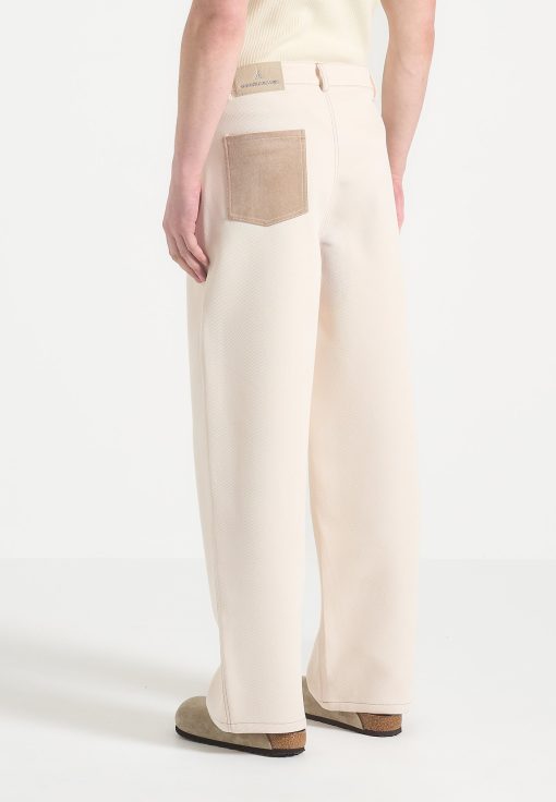 Crafted for contrast and presence, the Wide Leg Twill Jeans elevate utility through tonal blocking and engineered volume. Featuring oversized suede-effect panels at the hip and rear, they reinterpret workwear codes with refined tactility. The structured twill base and wide leg cut deliver sharp proportions, while minimal detailing keeps the focus on silhouette and material interplay.