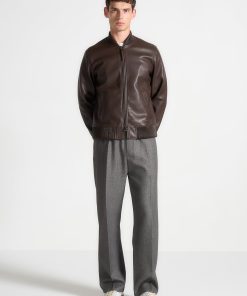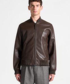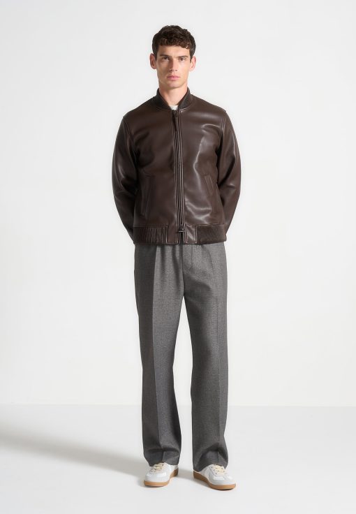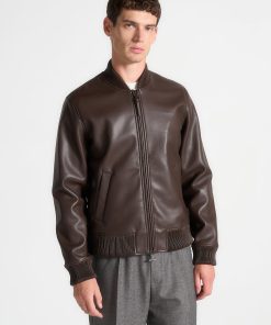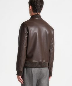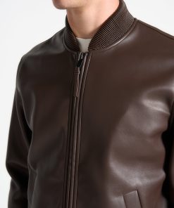 The Vegan Leather Bomber Jacket in Brown is crafted from smooth vegan leather, offering a sleek, modern finish. The bomber silhouette with ribbed knit detailing adds a subtle yet eye-catching detail, making this contemporary piece a versatile wardrobe staple.