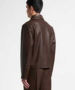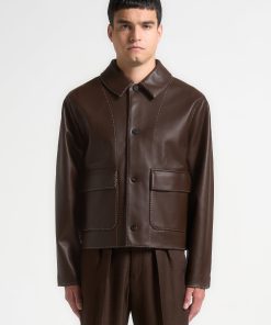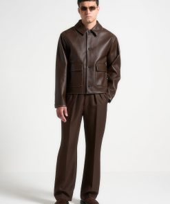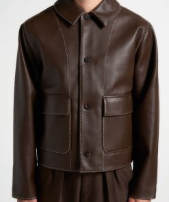 The Vegan Leather Contrast Stitch Jacket in Brown is crafted from smooth vegan leather, offering a sleek, modern finish. The bold contrast stitching adds a subtle yet eye-catching detail, making this classic piece a versatile and contemporary wardrobe staple.
