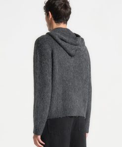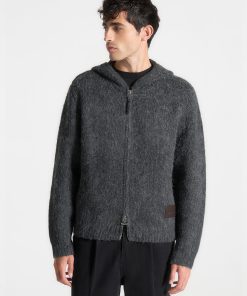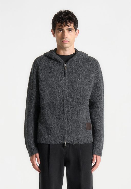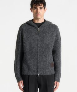 This Mohair Knit Zip Through Hoodie in Charcoal Grey offers a sleek, modern look with a touch of luxury. The mohair blend texture provides a premium feel, while the regular fit ensures all-day comfort. The hooded silhouette adds a contemporary edge, making it easy to style for casual or elevated seasonal outfits. A perfect blend of comfort and style, this hoodie is a versatile wardrobe essential.