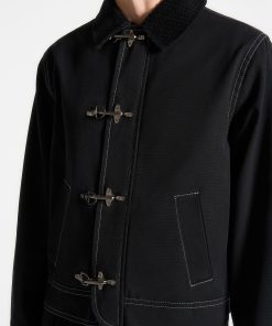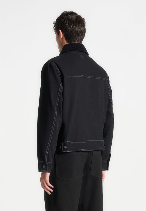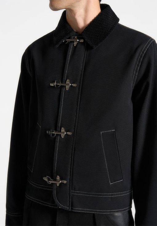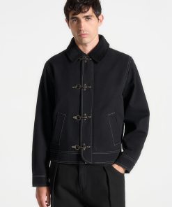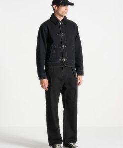 The Clasp Detail Contrast Stitch Gabardine Jacket in Black blends classic tailoring with modern touches, crafted from premium gabardine for a structured finish. Contrast stitching highlights its sleek silhouette, while distinctive clasp closures add a contemporary edge. Complete with a notched collar, streamlined sleeves, and discreet side pockets, this fully lined jacket offers both style and functionality in a tailored fit.