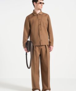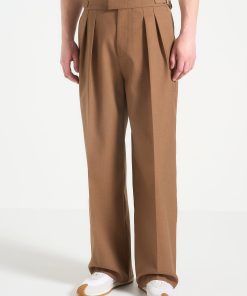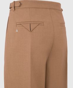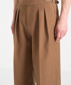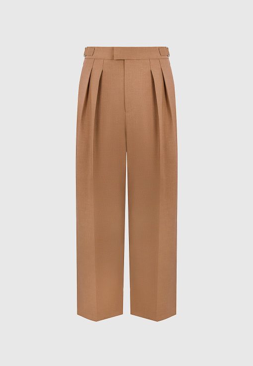 The Wide Leg Twin Pleat Tailored Trousers are constructed with directional volume through sharp twin front pleats, allowing the fabric to fall cleanly while preserving structure. Integrated side adjusters are engineered into the waistband for a seamless fit refinement system, eliminating the need for a belt without compromising on silhouette control.
