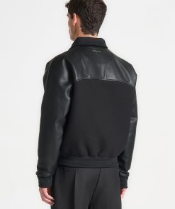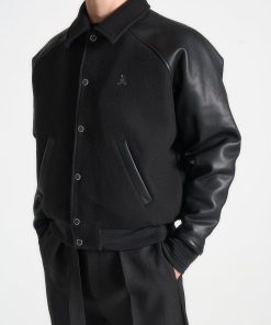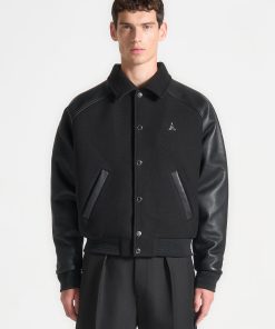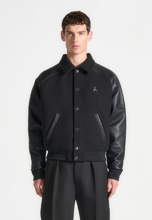 Introducing our Vegan Leather Raglan Varsity Jacket in Black.This jacket combines a classic retro silhouette with contemporary flair, featuring premium vegan leather, striped detailing on the hem and cuff and finished with a practical popper button closure, offering the perfect blend of style and functionality.