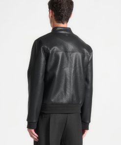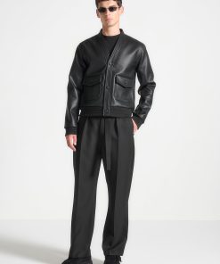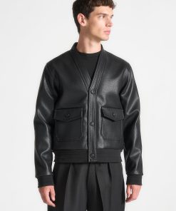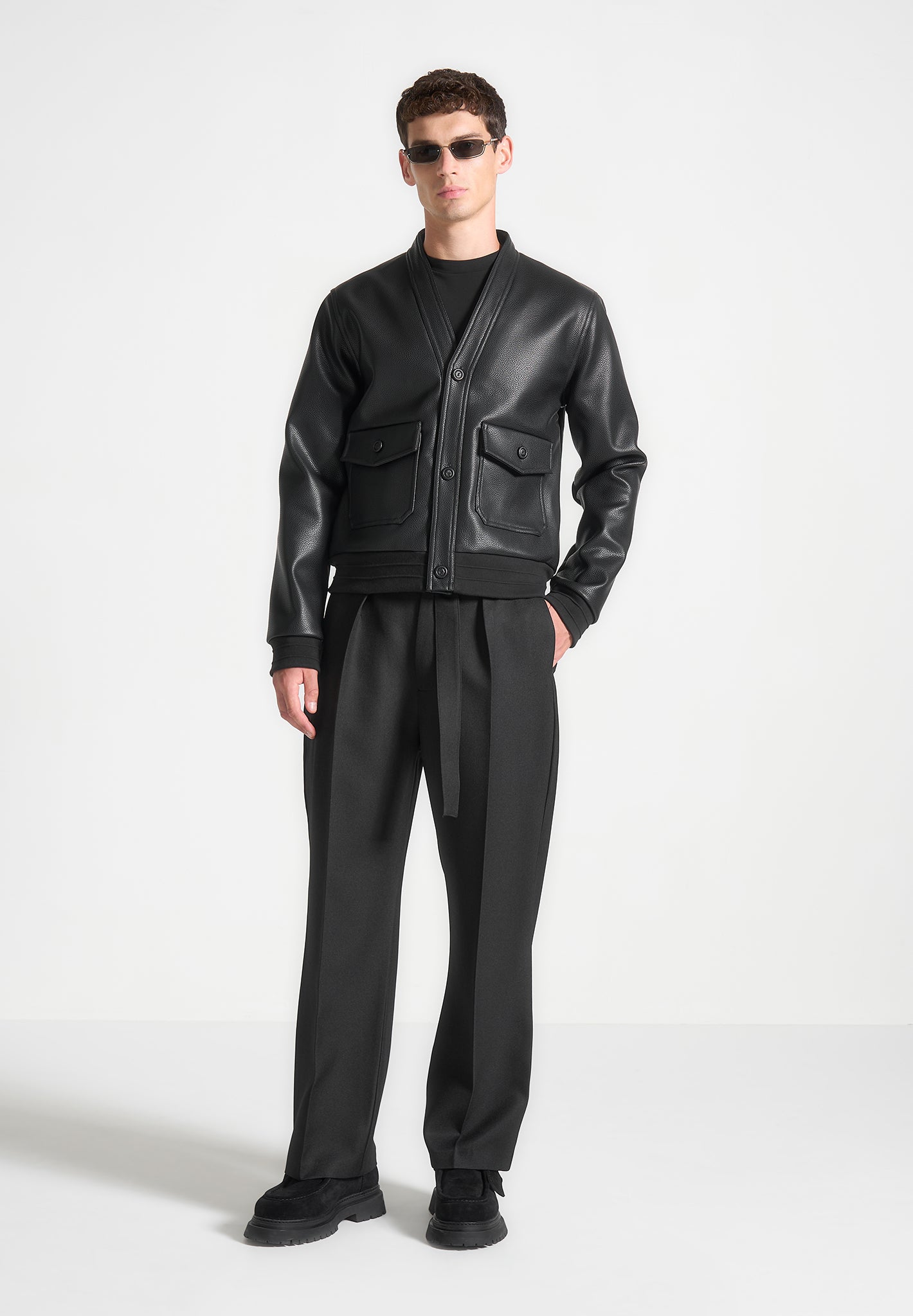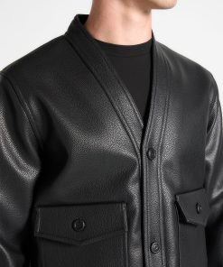 Introducing our Pebbled Leather Cardigan in Black, featuring a varsity-style silhouette for a contemporary take on aclassic. The vegan pebbled leather texture gives it a unique finish, while the elasticated hem and cuffs ensure acomfortable fit. Complete with front pockets, this Cardigan offers both style and practicality for any occasion.