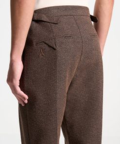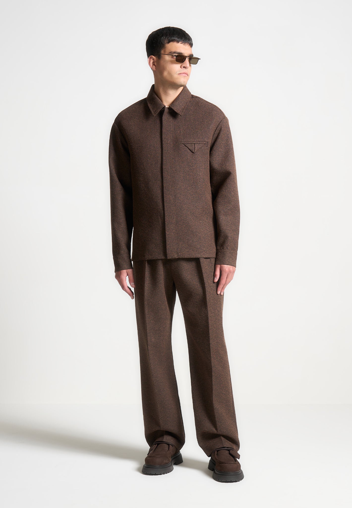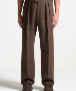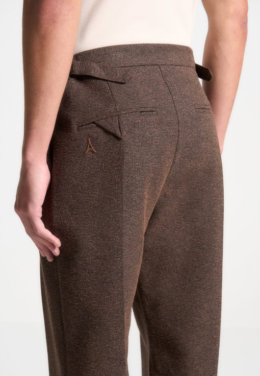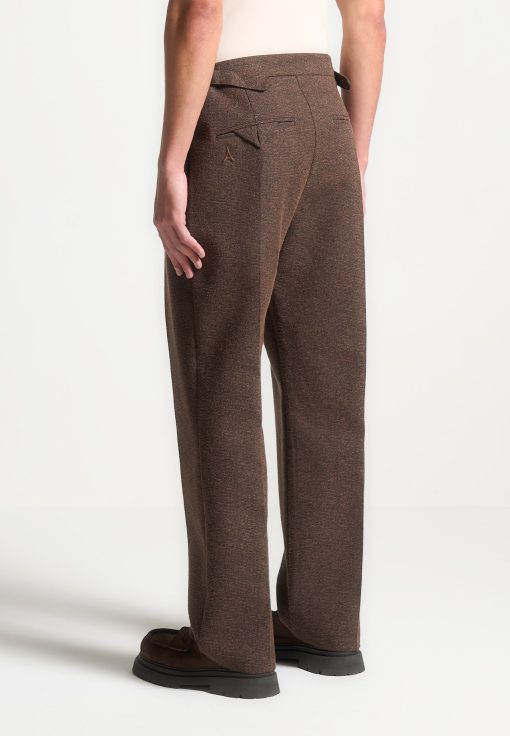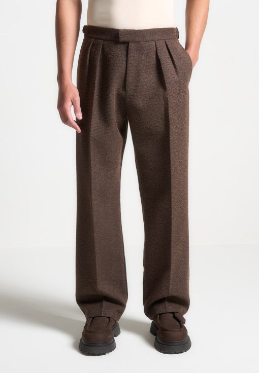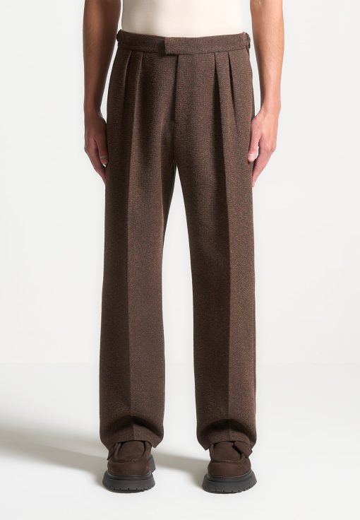 Elevate your wardrobe with the Relaxed Fit Melange Tailored Twin Pleat Trousers in Brown, featuring a unique triangle pocket design and double pleats for added comfort and style. The straight leg cut, side adjusters, and side slip pockets ensure a secure and tailored fit. Crafted from a blend of 93% polyester and 7% rayon, these trousers offer a premium feel and durability.