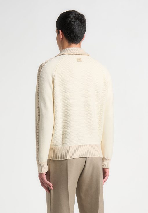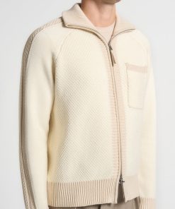 The Colour Block Zip Through Cardigan in Cream offers a contemporary twist to a classic silhouette with its unique ribbed funnel neck and contrasting textured panels. Finished with sleek Silver hardware and a front pocket for added functionality, this cardigan brings both style and versatility to any outfit.
