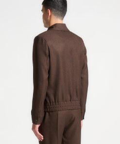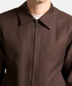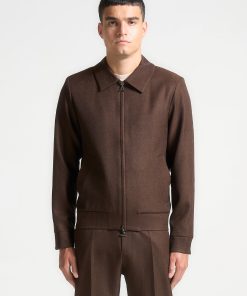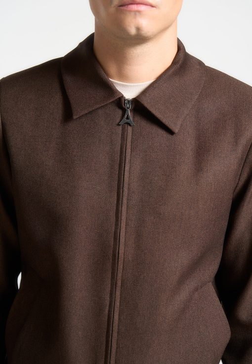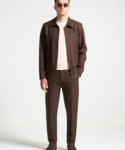 Introducing our Tailored Harrington Jacket in Brown, a modern essential with timeless appeal. Designed for both style and comfort, it features an elasticated hem, front welt pockets, and a classic harrington collar. The front zip, accented with a Silver Eiffel Puller, adds a touch of refinement to this versatile piece. Pair with the Slim Fit Pleated Tailored Trouser in Beige for a completed ensemble.