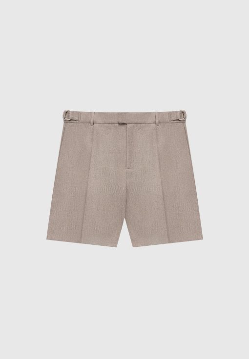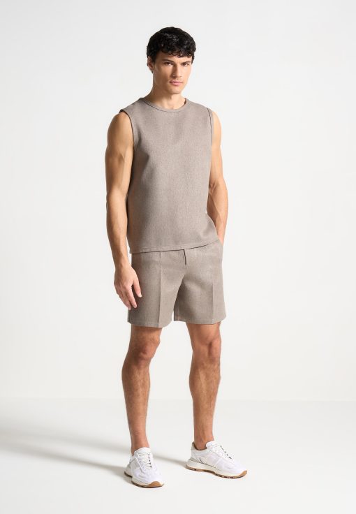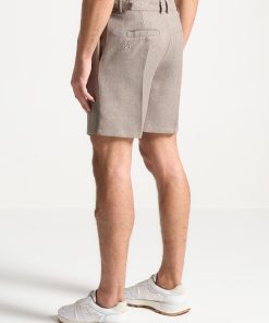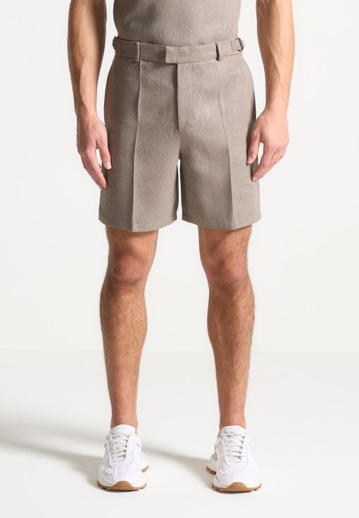 Elevate your wardrobe with our Textured Tailored Shorts in Taupe, offering a relaxed fit for enduring comfort throughout the day. With side slip pockets and a pleat to crease detail, these trousers effortlessly blend practicality with style, a must-have addition to your collection.