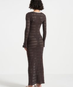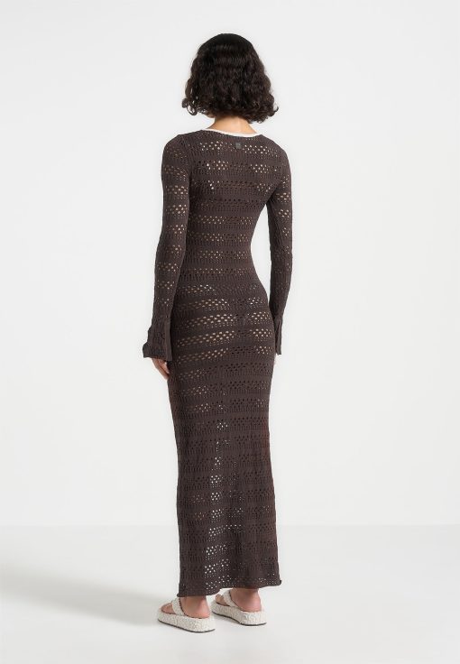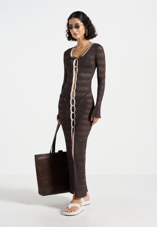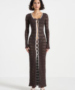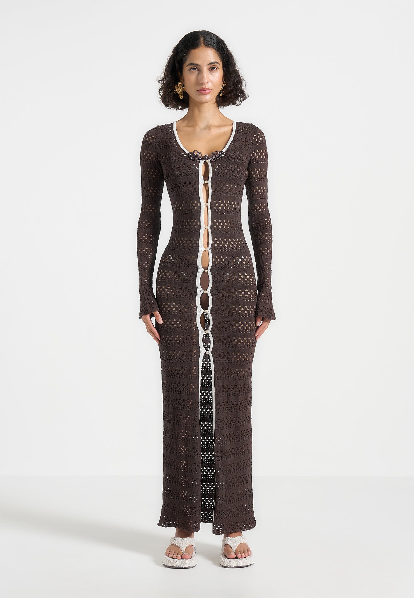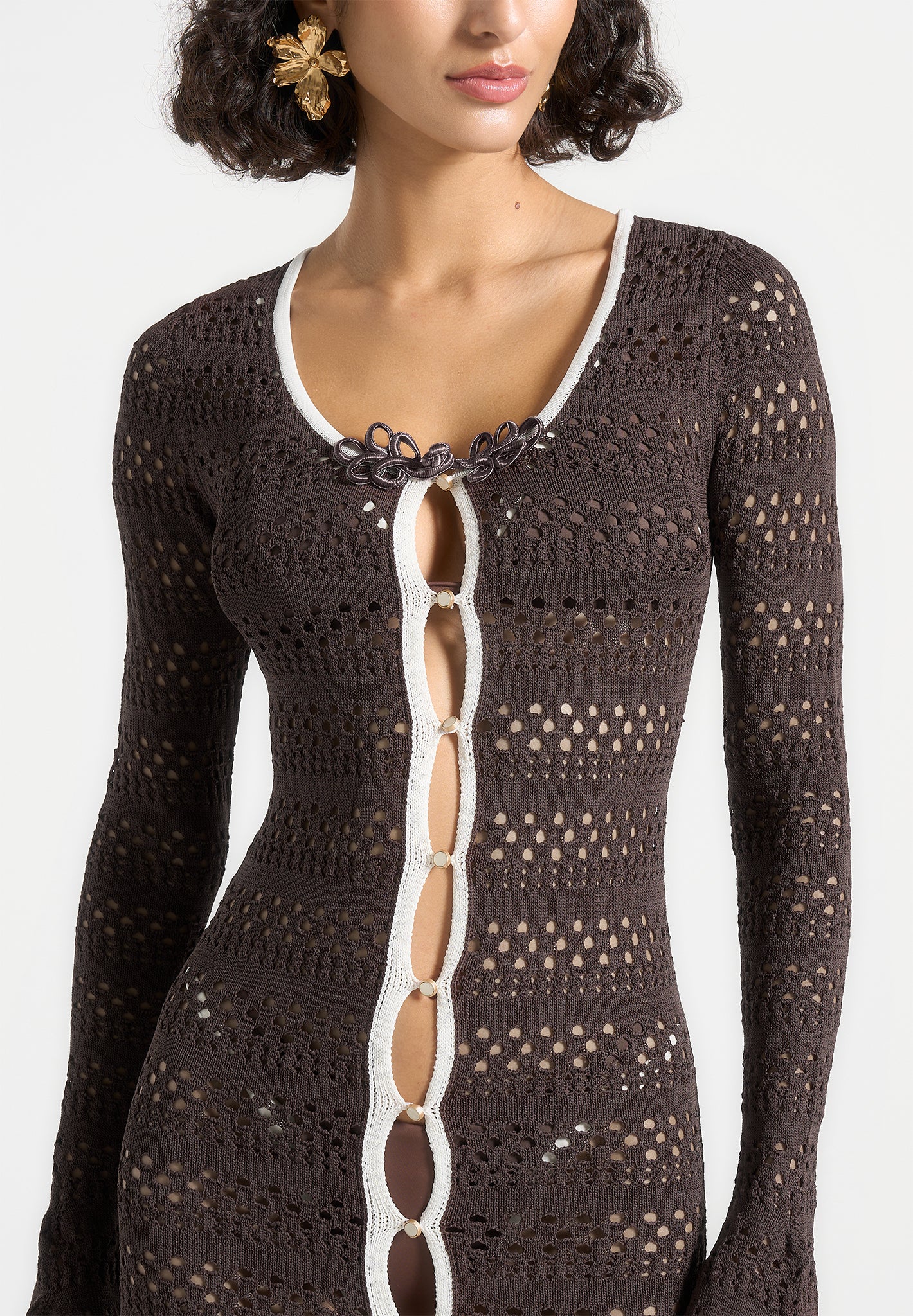 This lightweight crochet cover-up blends relaxed sophistication with tactile detail, offering an effortless layer for beach-to-bar transitions. Crafted in a soft pointelle open-knit, it features a full-length silhouette with a button-down front and subtly flared sleeves for a touch of movement. The airy construction enhances breathability while the intricate pattern adds artisanal charm. Finished in rich brown hue, it strikes the perfect balance between elegance and ease—ideal for styling over swimwear on sun-soaked days.
