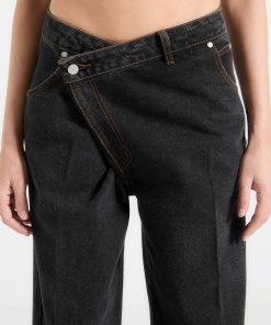 These Wrapover Wide Leg Jeans feature a wrapover waistband and full-length crease, offering a contemporary, comfortable fit. Crafted from 18oz denim, they are detailed with contrast stitching for added sophistication.