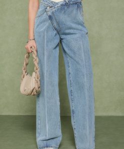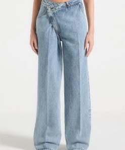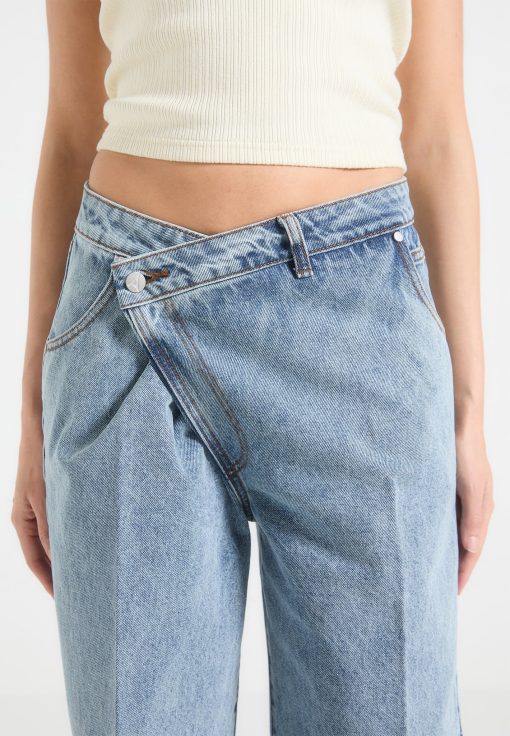 These Wrapover Baggy Jeans feature a wrapover waistband and full-length crease, offering a contemporary, comfortable fit. Crafted from 18oz denim, they are detailed with contrast stitching for added sophistication.