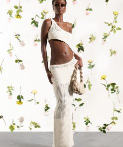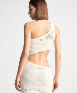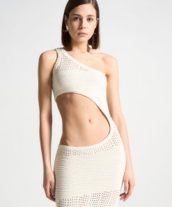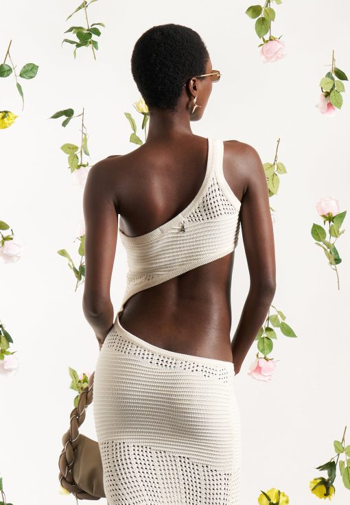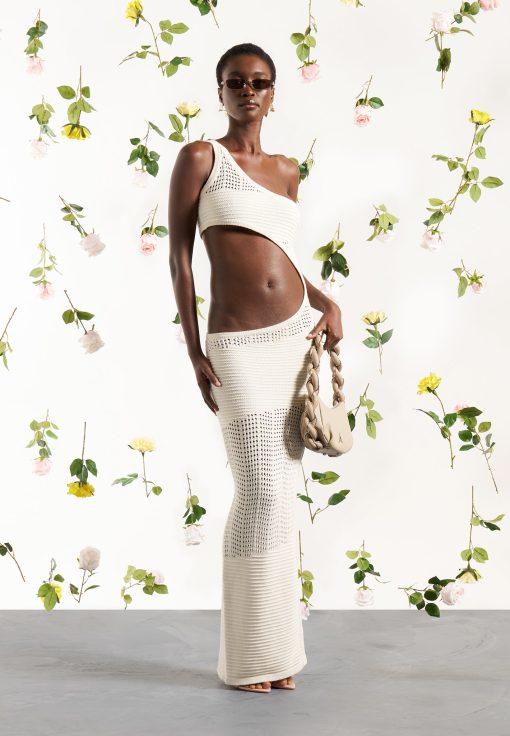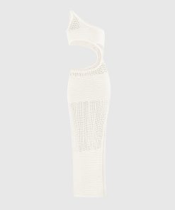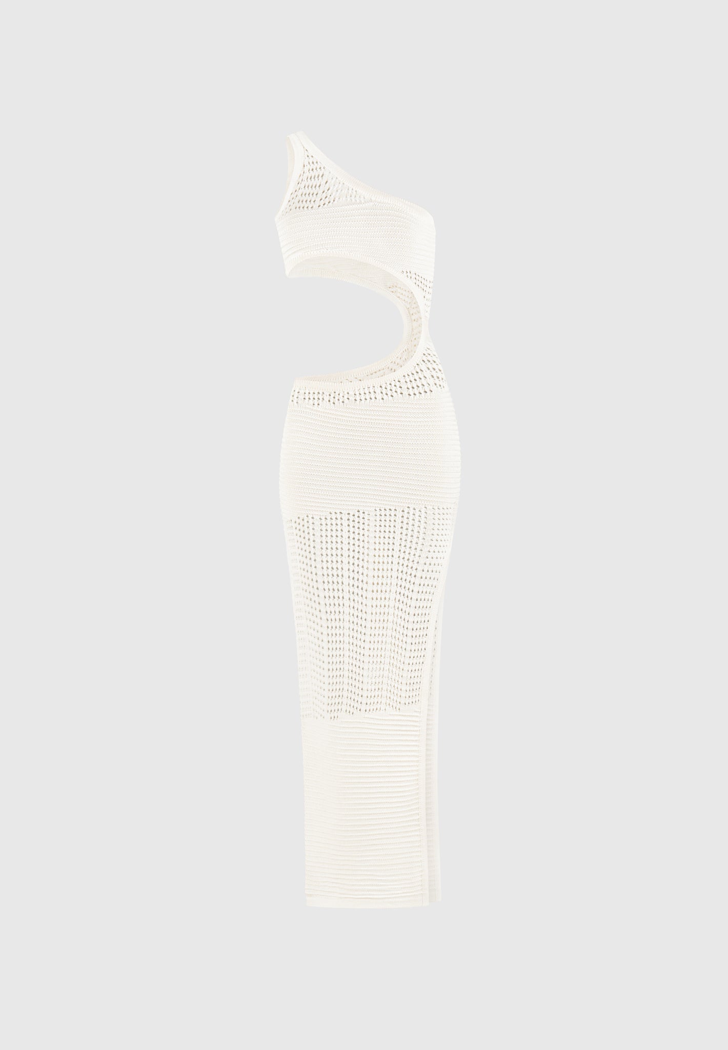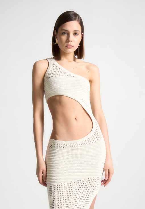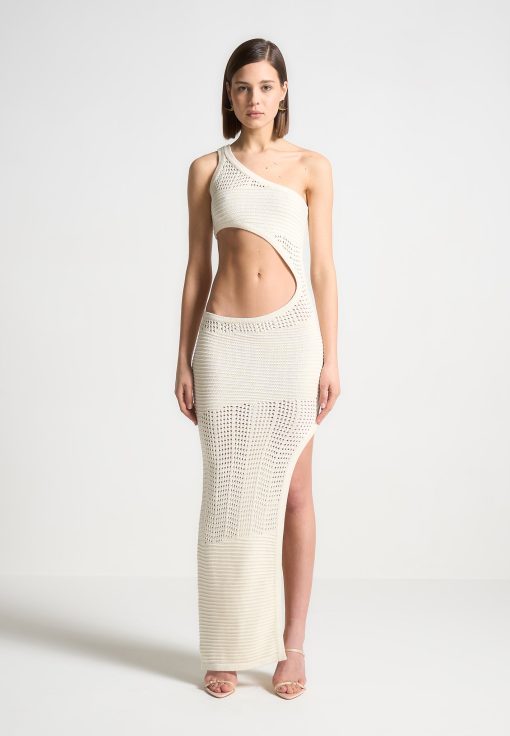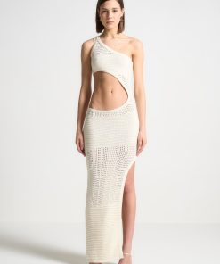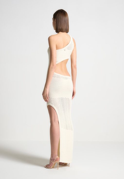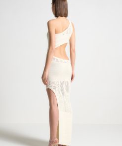 Expertly crafted and designed, this Asymmetric Crochet Knit Cut Out Maxi Dress in Cream features alternate knit panels for a unique and eye-catching look. Its soft knit fabric provides all-day comfort, while the asymmetric design adds a touch of elegance. Stand out from the crowd in this stunning maxi dress.