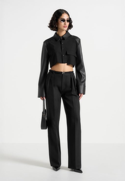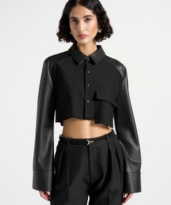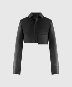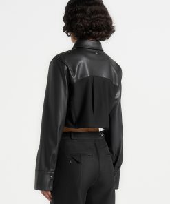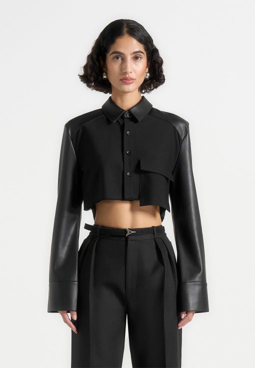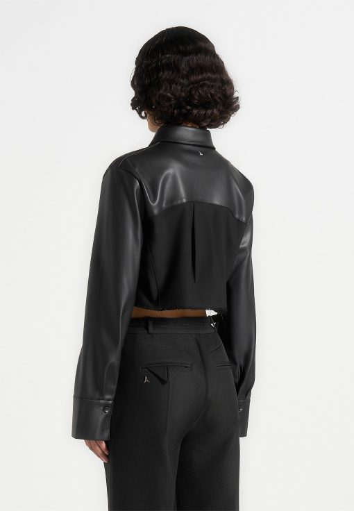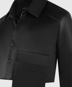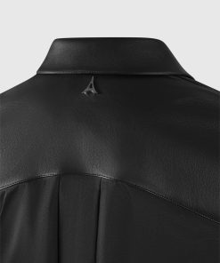 Elevate your wardrobe with this Vegan Leather Shirt. Featuring a classic silhouette with contrasting fabric, this stylish shirt perfect for all occasions. Dress it up or down for a sleek yet timeless look.