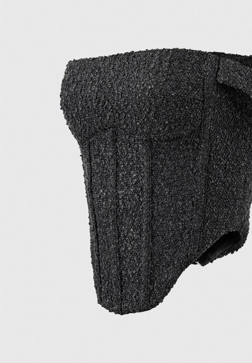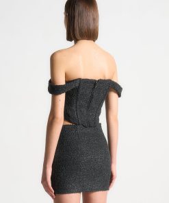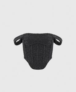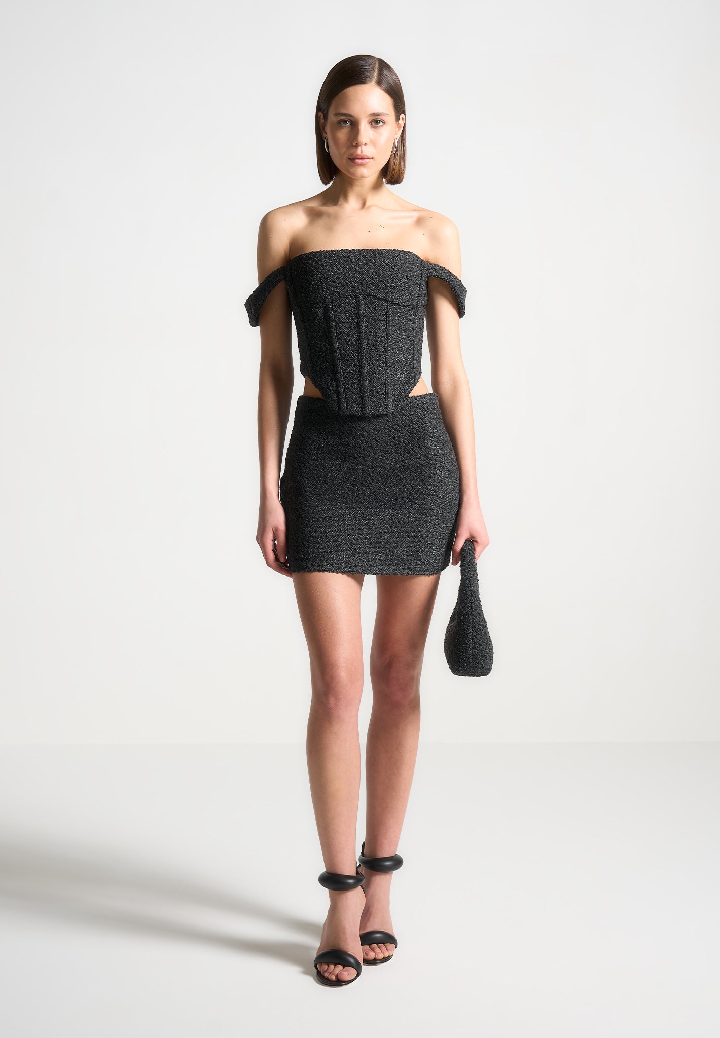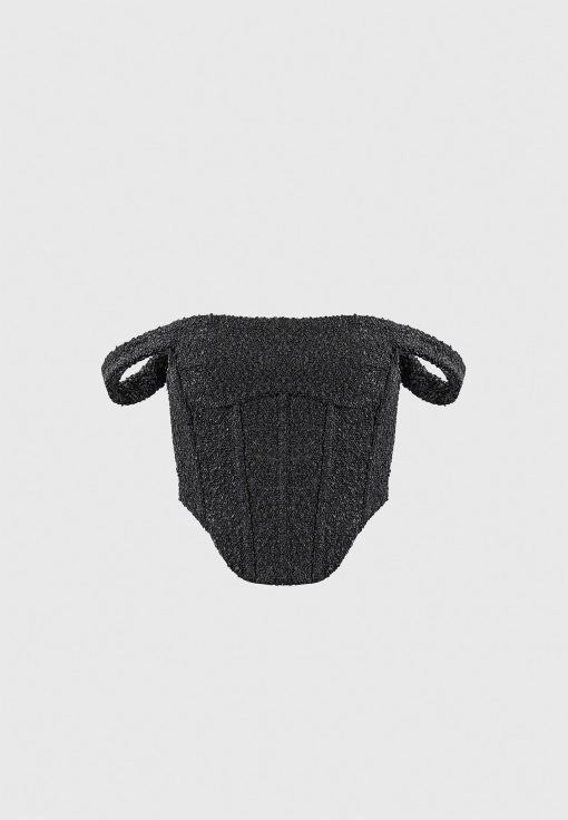Crafted from high-quality boucle fabric, this Bardot corset top boasts an elegant dipped hem. With a sleek and sophisticated design, this top is perfect for any occasion. Upgrade your wardrobe with this versatile and stylish piece.
