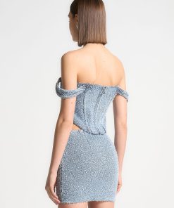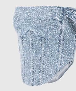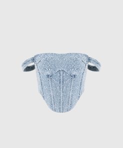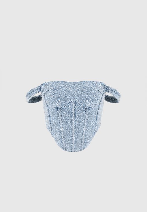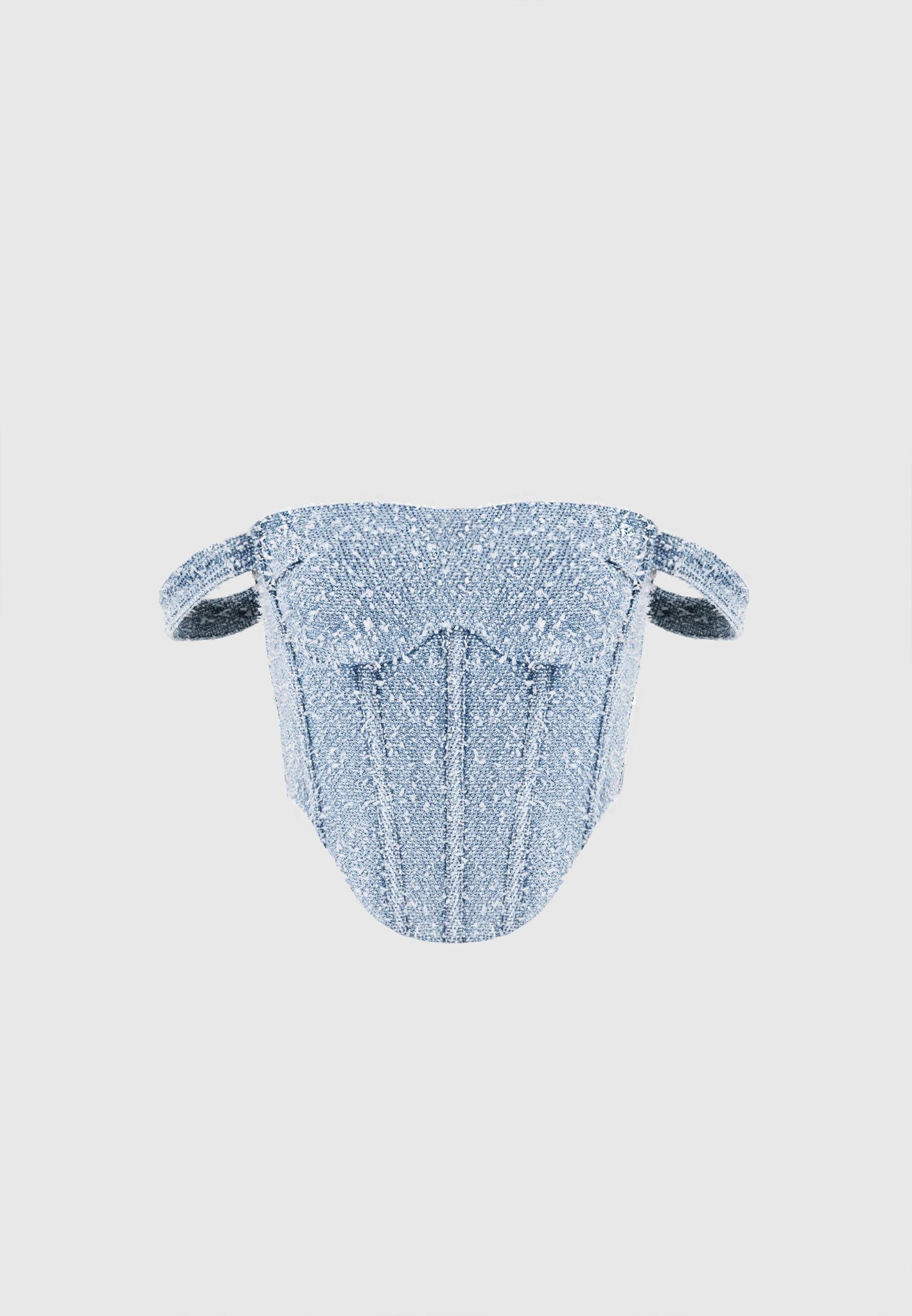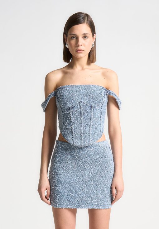 Expertly crafted with a bardot neckline and textured fabric, the Boucle Denim Bardot Corset Top in Mid Blue exudes structured sophistication. Elevate any outfit with its flattering silhouette and timeless design.