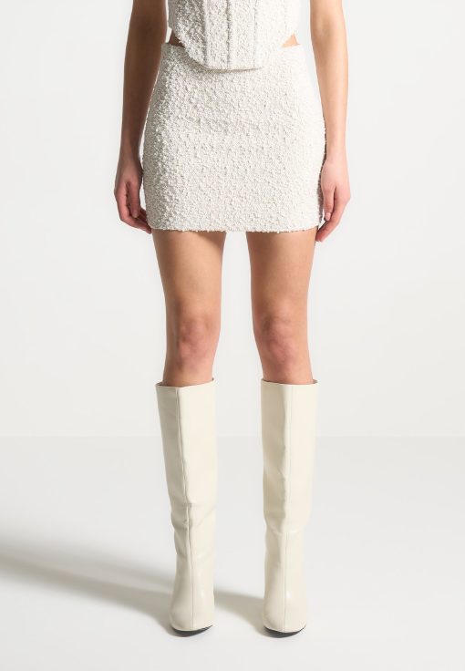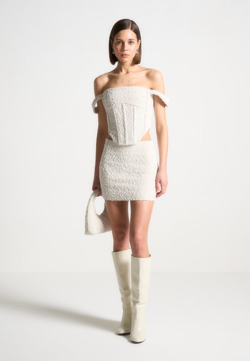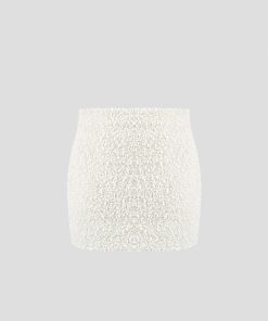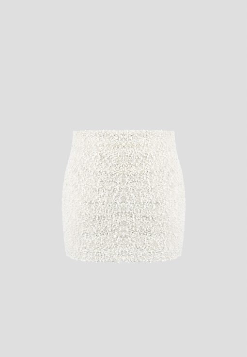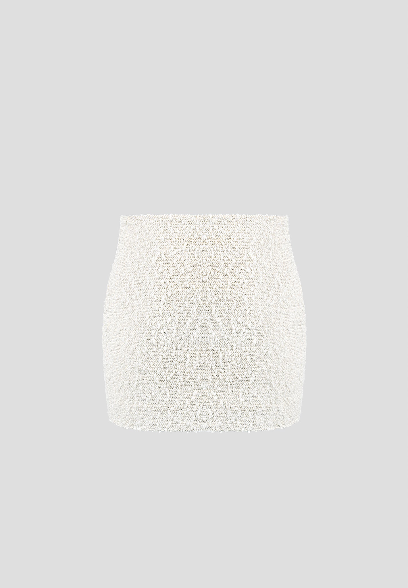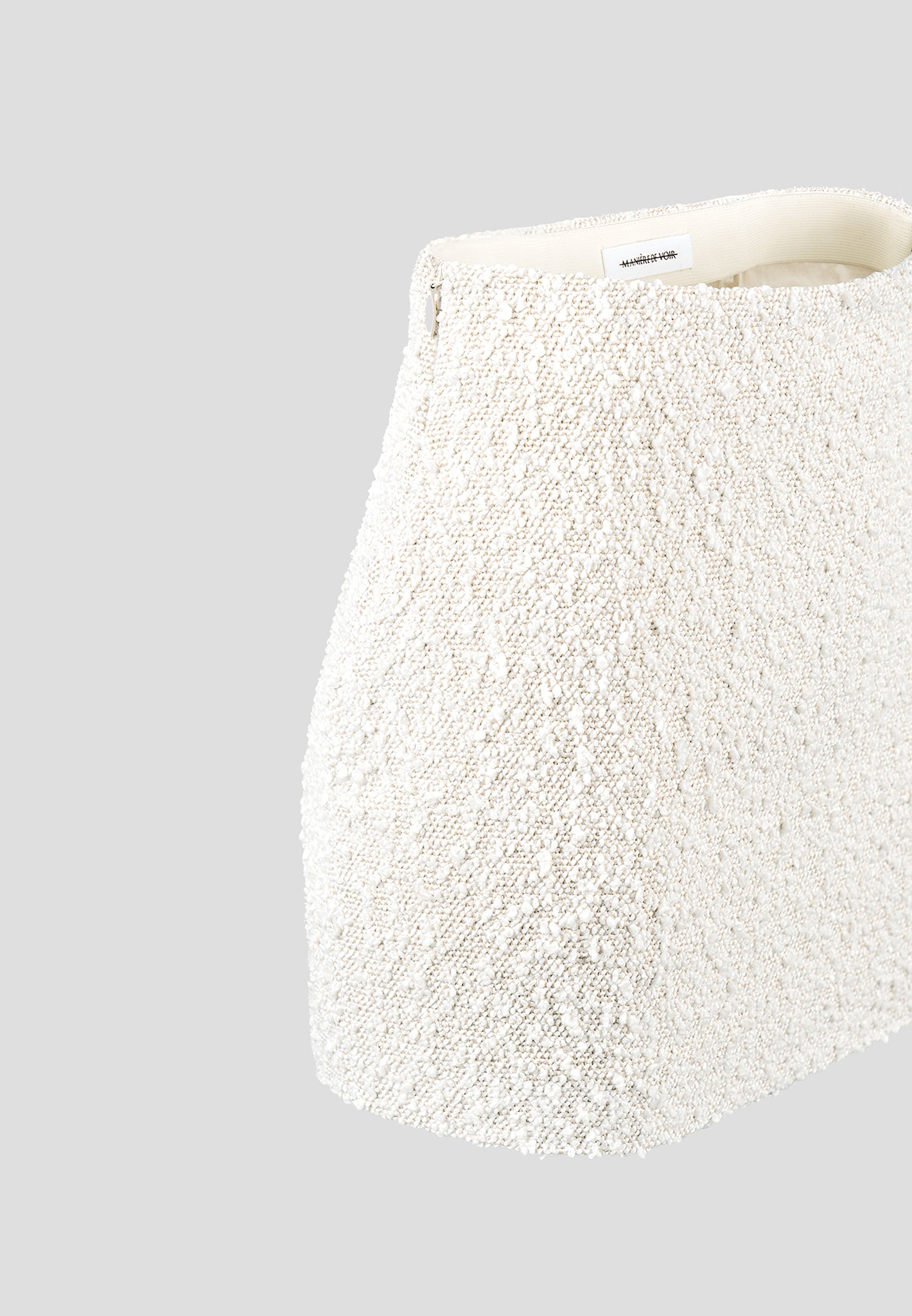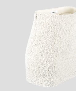 Crafted from high-quality Boucle fabric, this off-white mini skirt boasts a flattering fit that is perfect for any occasion. The elasticated waistband provides a comfortable and secure fit, while the invisible zip adds a touch of sophistication. Elevate your wardrobe with this must-have piece.