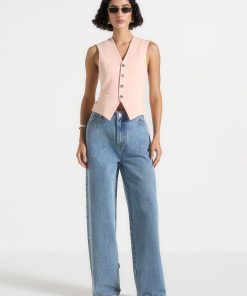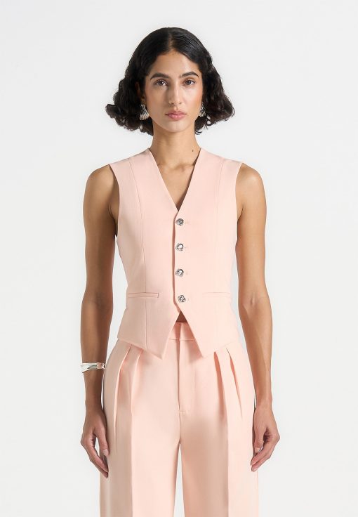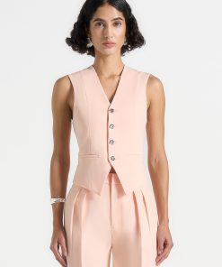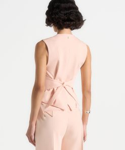 Elevate your layering with this sculpted waistcoat. Defined by its cinched waist, contour detailing and shaped front darts. Finished with a cinch waist tie for a defined silhouette. The unique shaped feature buttons and faux welt pockets deliver structured elegance with a standout edge.