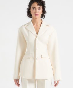 Precision-tailored for a refined aesthetic, the Wide Shoulder Cinch Waist Blazer features a sculpted waist for a flattering silhouette. Structured shoulder pads enhance its sharp profile, while tonal feature buttons add a sophisticated finishing touch.