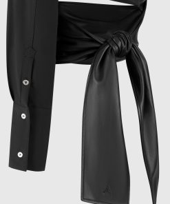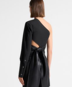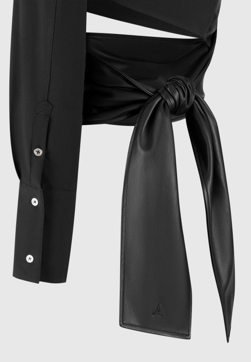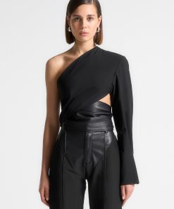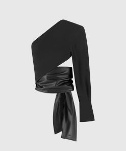 Upgrade your wardrobe with our One Sleeve Vegan Leather Wrap Top. This statement piece features a unique shape and contrasting fabrics for a bold and modern look. The voluminous tie adds a touch of sophistication, perfect for any occasion. Expertly crafted for a stylish and sustainable alternative to leather.