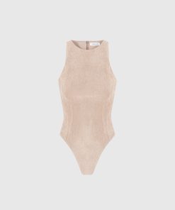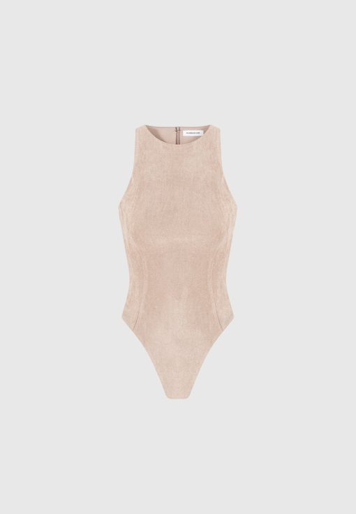 Crafted from the softest vegan suede, our Éternelle Bodysuit features a racer neck design and invisible zip for a sleek, figure-flattering silhouette. Enjoy a luxurious touch and effortless style with every wear.