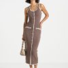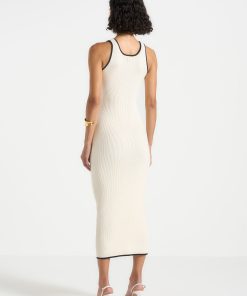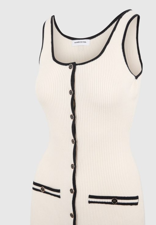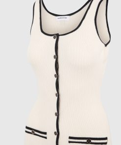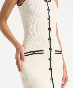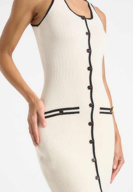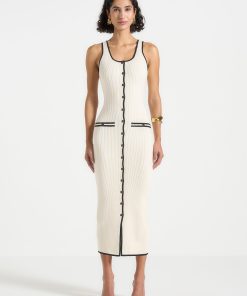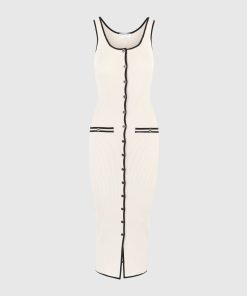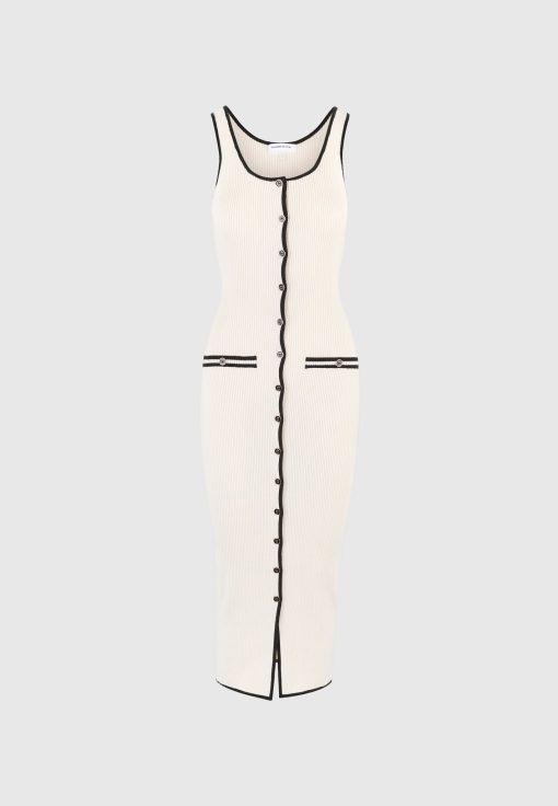 This ribbed midi dress fuses modern tailoring with classic contrast detailing. Designed in a body-contouring knit, it features a scoop neckline, a full-length button front, and black contrast piping that sharpens the silhouette. Faux pocket accents and vertical ribbing enhance the lengthening effect, while the midweight stretch fabric ensures structure with ease of movement—perfect for refined daywear or elevated evenings.