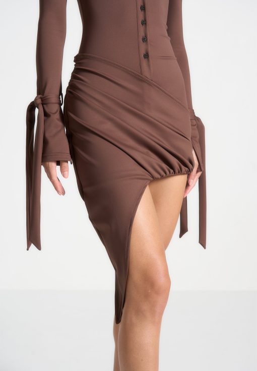 This elegant mini dress features a flattering fit and draped skirt, complemented by wide shoulders and wrist ties for added style and detail. Perfect for any occasion, this dress is a versatile addition to any wardrobe.