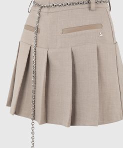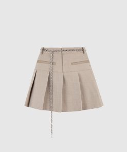 This pleated mini skort brings a contemporary edge to classic tailoring. Cut from structured suiting fabric, it features crisp knife pleats and a fitted waistband that sits high on the waist for a flattering silhouette. Faux welt pockets and belt loops nod to traditional tailoring, while the detachable silver-tone chain belt adds a directional finish.
