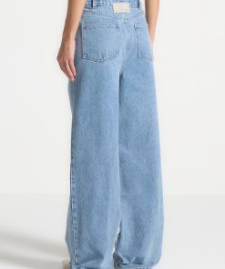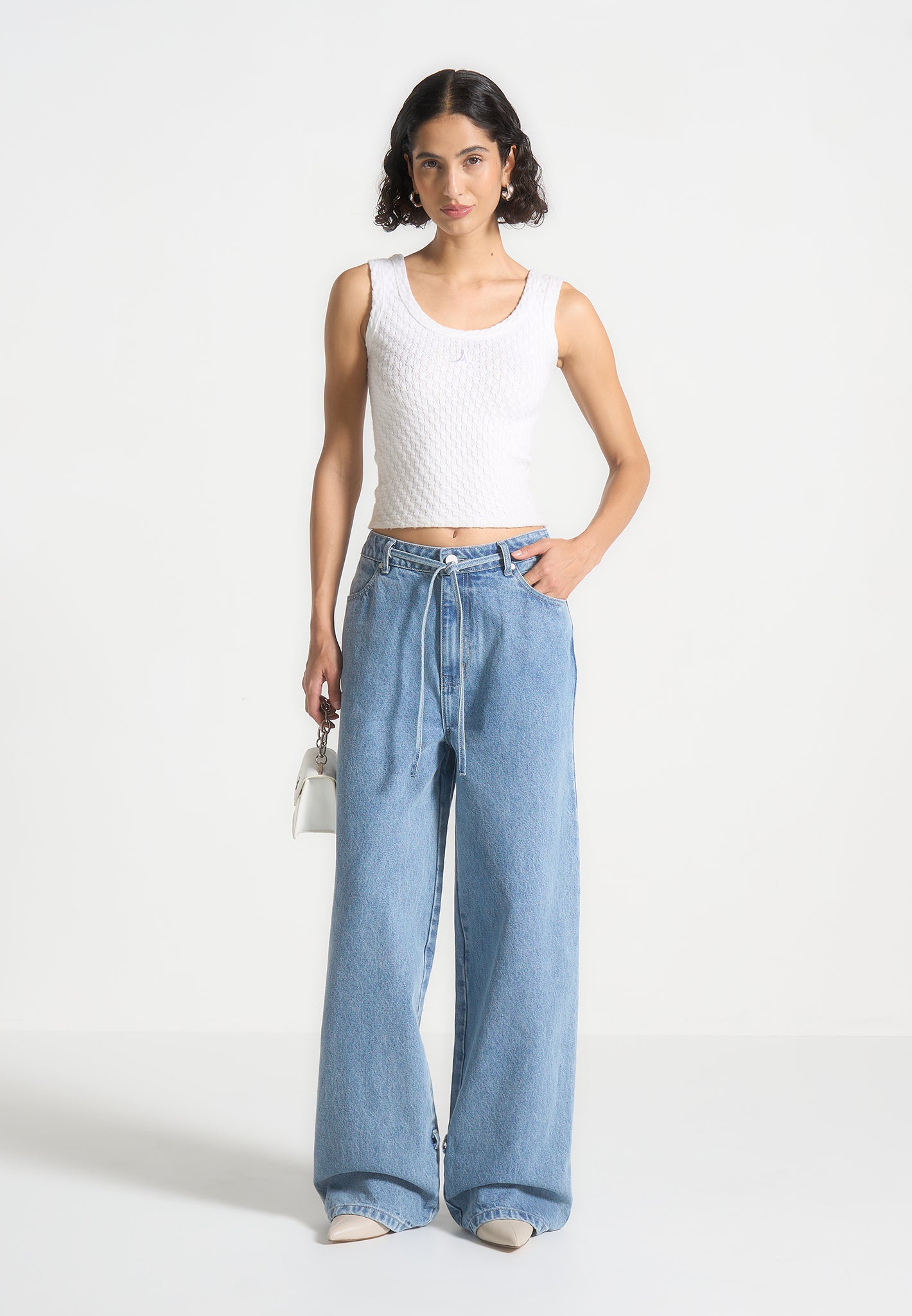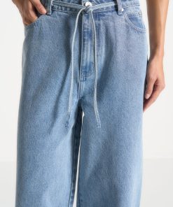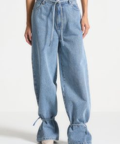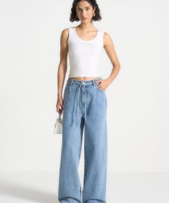 Elevate your look with our Wide Mid Rise Jeans in Mid Blue. Featuring distinctive hem and waist tie details, these jeans bring a subtle touch of sophistication to any ensemble. Crafted from high-quality denim, they offer a perfect blend of comfort and style. Enhance your wardrobe with these versatile, statement-making jeans.