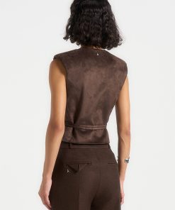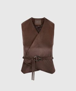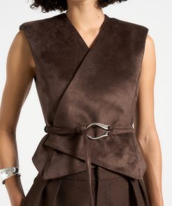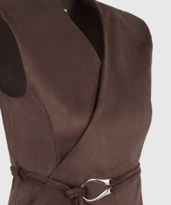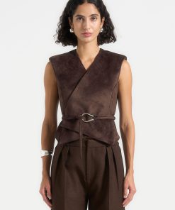 This sleeveless wrap waistcoat brings soft structure and elevated texture to any wardrobe. Crafted from a rich faux suede fabric, it features strong shoulders and a softly draped silhouette, cinched at the waist with a tonal belt and silver hardware detailing. The wrap-style front adds dimension and movement, while the subtle sheen of the fabric gives a refined, modern edge—perfect for dressing up denim or tailoring.