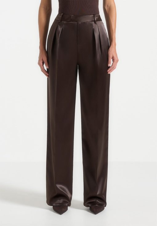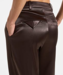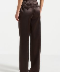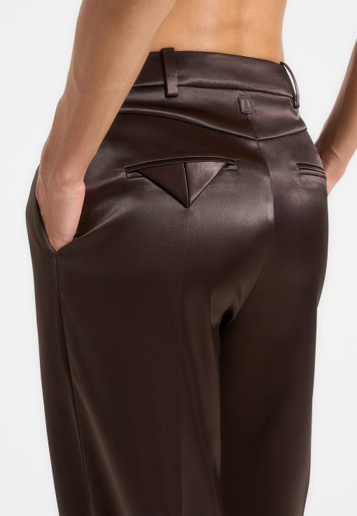These satin tailored twin pleat trousers elevate traditional suiting with a luxurious, high-shine finish. Cut from smooth satin fabric, they feature sharp twin pleats at the front, a structured waistband, and a wide-leg silhouette that elongates the frame. At the back, welt pockets are enhanced with a distinctive angular flap detail, complemented by a tonal vegan leather Eiffel plaque for a subtle branded accent. Designed in a rich brown hue, the glossy texture adds depth and polish—ideal for elevated tailoring or occasion styling.