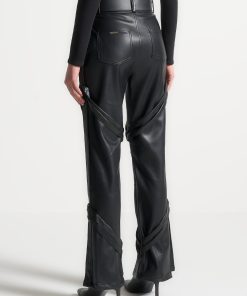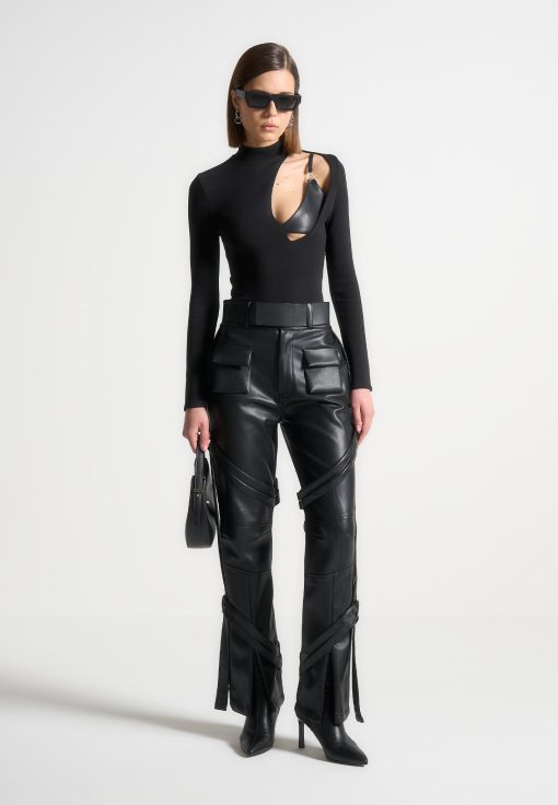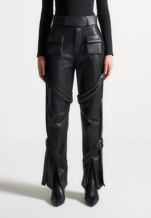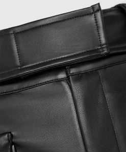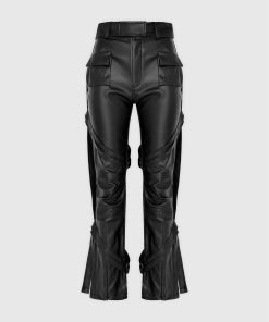 The Vegan Leather Carpenter Cargo Trousers have a casual feel thanks to the sizeable cargo pockets, but are designed with just as much consideration as a going out style. Made from vegan leather with a straight leg, deep waistband and carpenter belt detailing. The invisible zips at hem can be used for versatile styling for both casual and dressy looks.