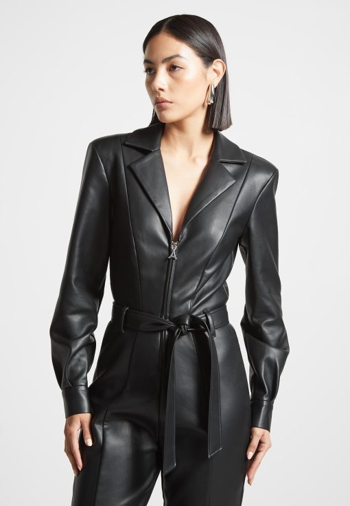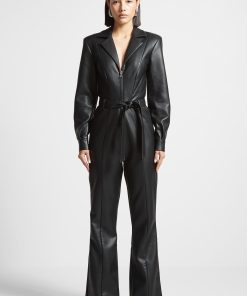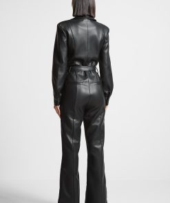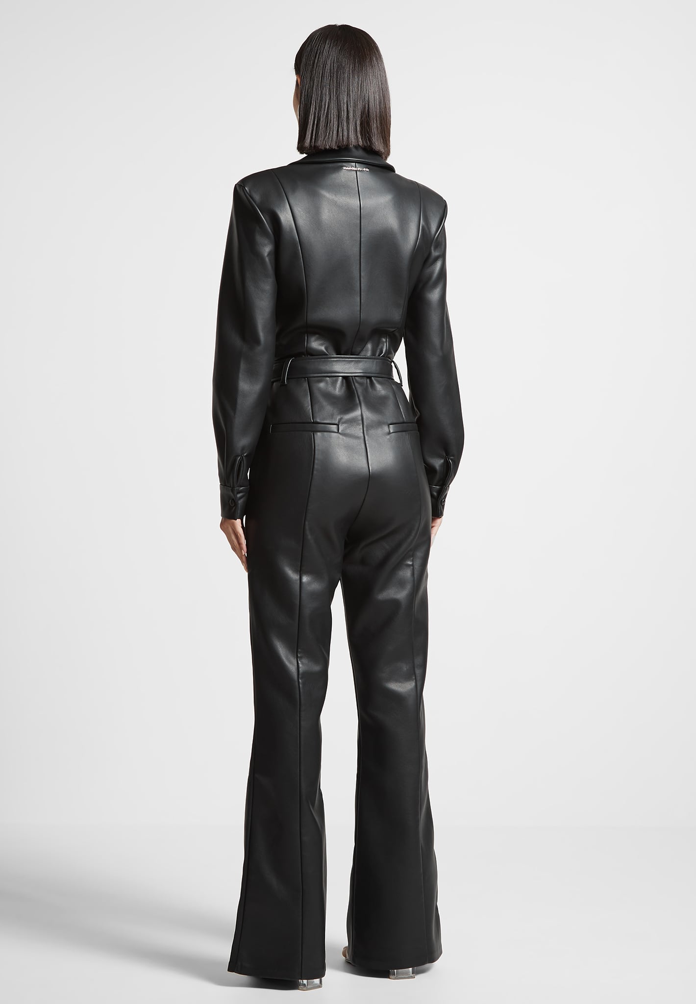 This stylish jumpsuit offers a tailored fit and flare leg silhouette to give you an effortlessly chic look. Made with vegan leather, you’ll look fabulous while still being conscious of your fashion choices.