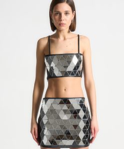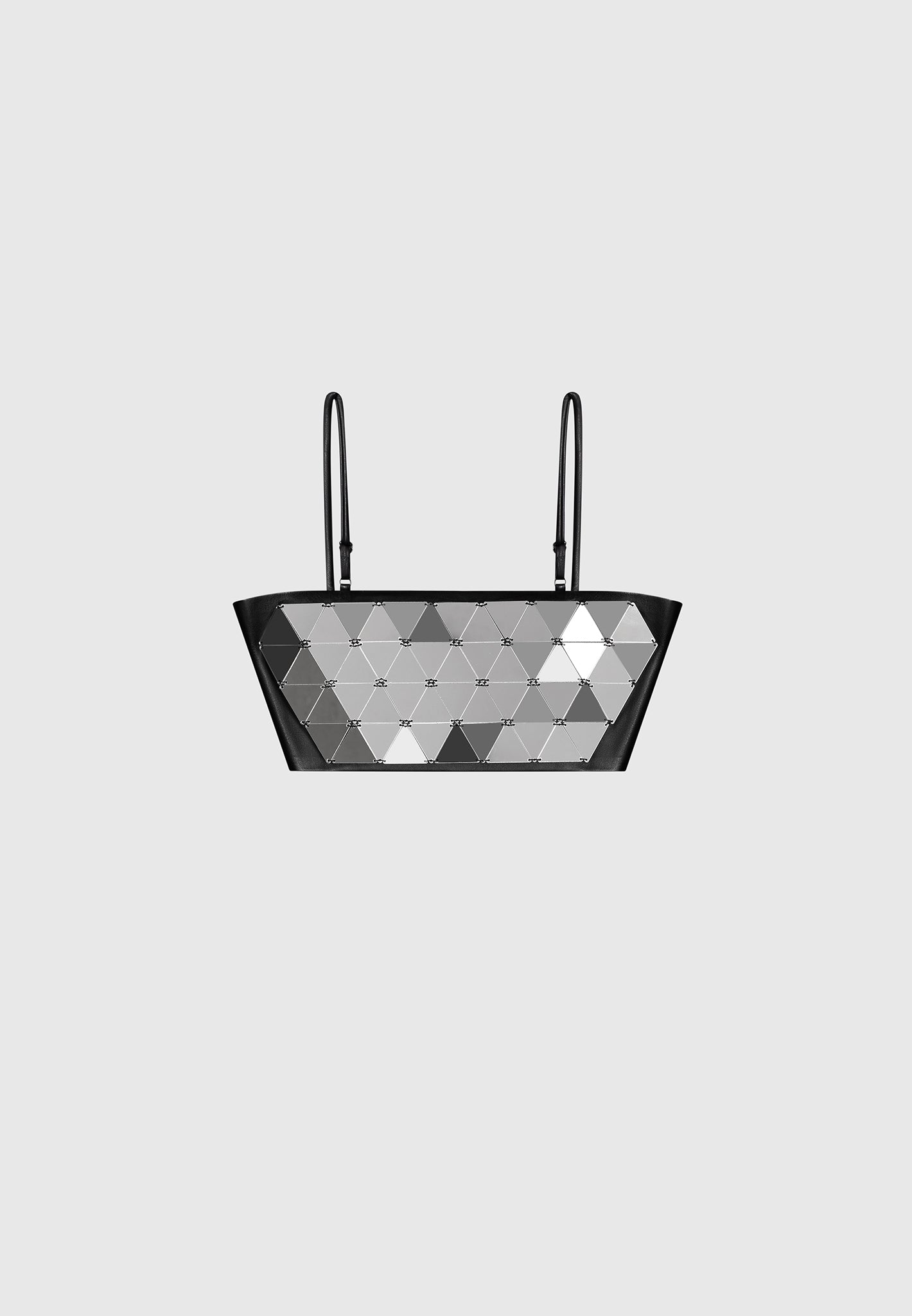 This Vegan Leather Mirrored Bandeau Top features a unique shape and design, guaranteed to make you stand out from the crowd. With adjustable straps, you can customise the fit to your liking. Up your fashion game with this stylish and glamourous piece.