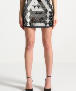This mini skirt is crafted from luxurious vegan leather and beautifully embellished with unique mirrored accents, ensuring you stand out in any crowd. Add a statement to any outfit with this chic, stylish piece.