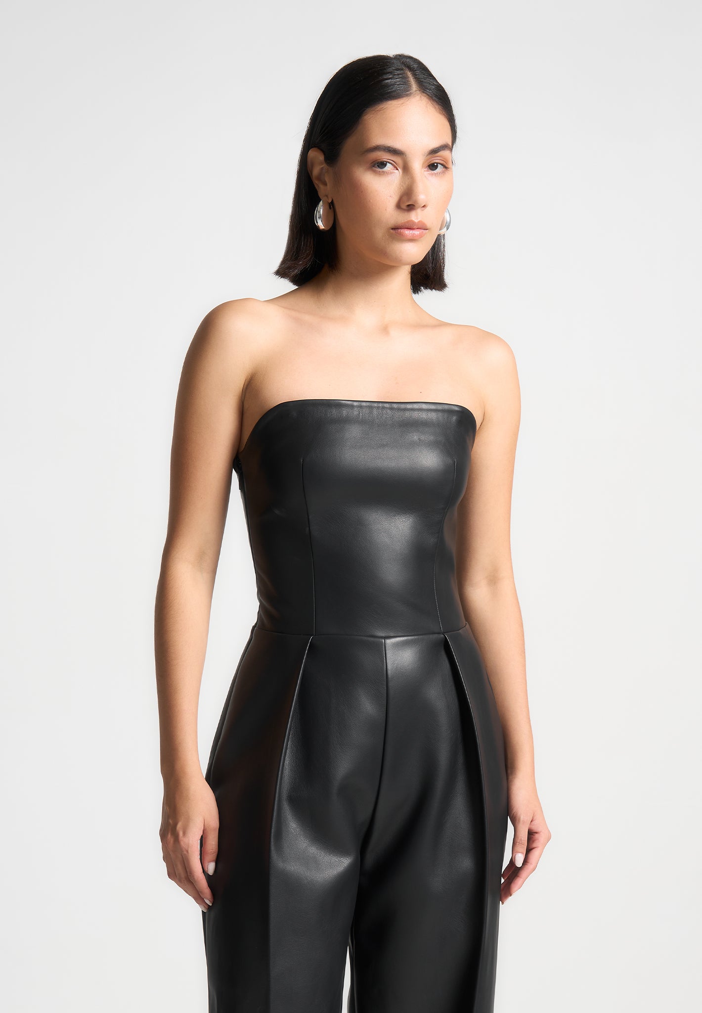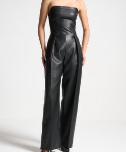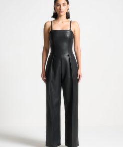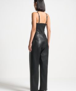 This stylish Vegan Leather Tailored Jumpsuit is a sophisticated addition to any wardrobe. Its tailored fit and wide leg create a flattering silhouette, perfect for evening events. Made of quality vegan leather, this jumpsuit is sure to become a long-lasting favourite.