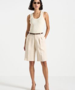These tailored longline shorts offer a refined alternative to traditional summer silhouettes. Cut from a breathable linen fabric, they feature a high-rise fit with sharp front pleats and a relaxed leg that finishes just above the knee. Back welt pocket detailing and a clean waistband lend a polished finish.
