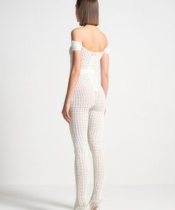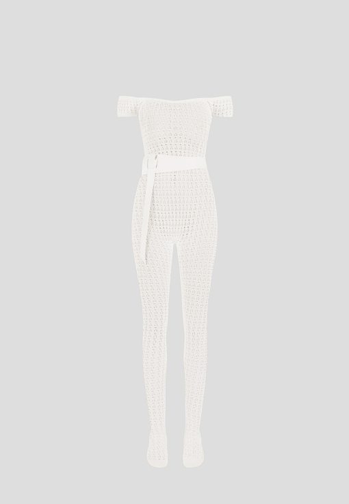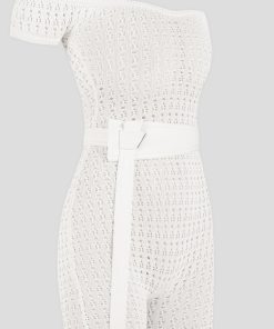 Crafted from high quality pointelle knit, this bardot jumpsuit offers a figure-flattering silhouette with its stretch fabric. Perfect for any occasion, the attached belt adds a touch of elegance to this unique and fashion forward piece.