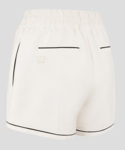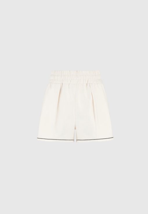 These tailored shorts bring polish to relaxed dressing. Cut from a smooth, structured fabric, they feature a softly gathered elastic waistband for comfort, pleated front detailing for shape, and contrast piping for a refined finish. Faux welt pockets at the back elevate the look, making them ideal for both lounging and elevated daywear. Pair them with the matching cropped shirt for a crisp, coordinated set.