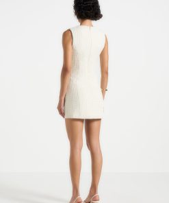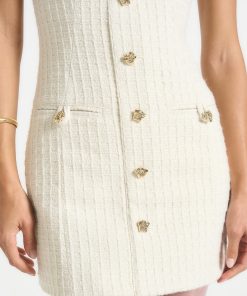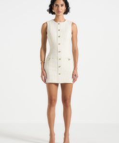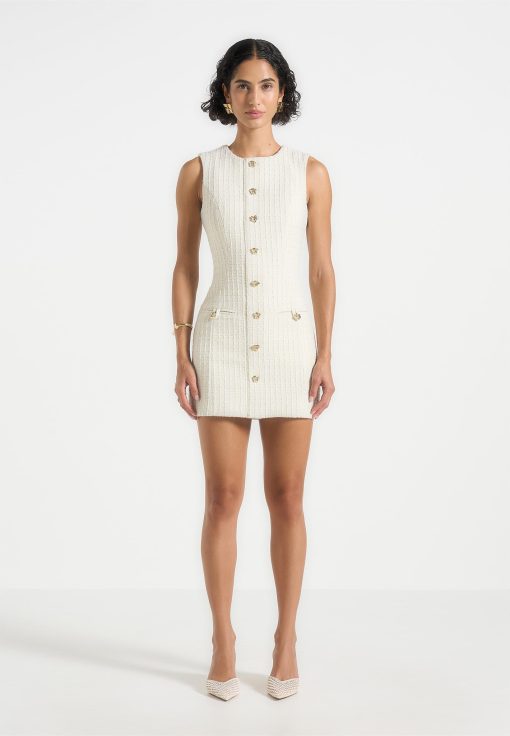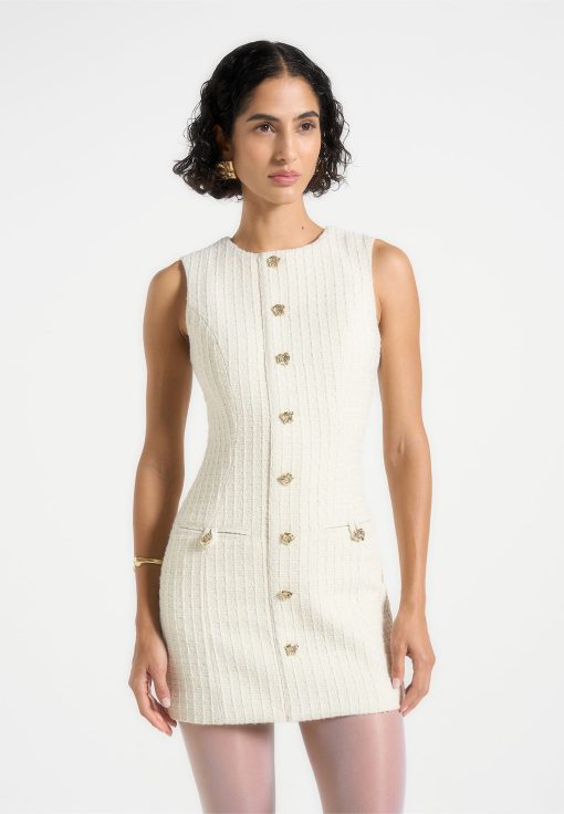 Crafted in a sophisticated woven tweed, this tailored mini dress blends texture and structure. Detailed with textured gold button accents and darted at the waist for a flattering fit, this dress is finished with a smooth satin lining for added comfort.