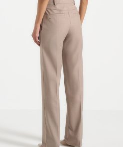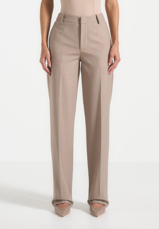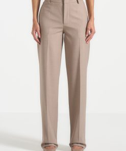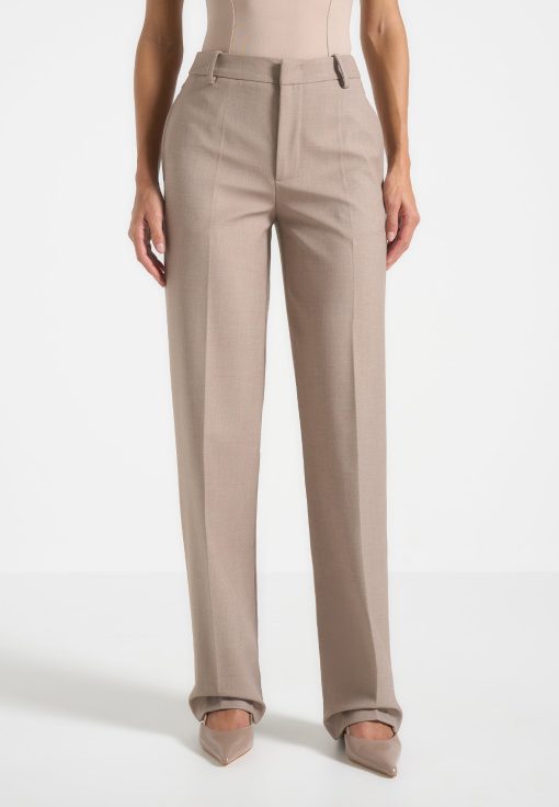 These cigarette fit tailored trousers offer a sleek, elongated silhouette with a softly structured finish. Cut from premium suiting fabric, they feature a mid-rise waist, sharp front pleats, and a slim straight leg for a refined, versatile shape. Pressed creases and subtle waistband detailing elevate the minimalist design, while the mushroom hue adds a contemporary, understated tone. Perfect for desk-to-dinner dressing or modern suiting sets.